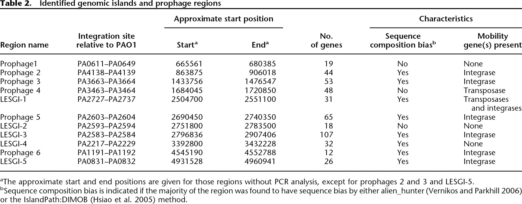 bSequence composition bias is indicated if the majority of the region was found to have sequence bias by either alien_hunter (Vernikos and Parkhill 2006) or the IslandPath:DIMOB (Hsiao et al. 2005) method.