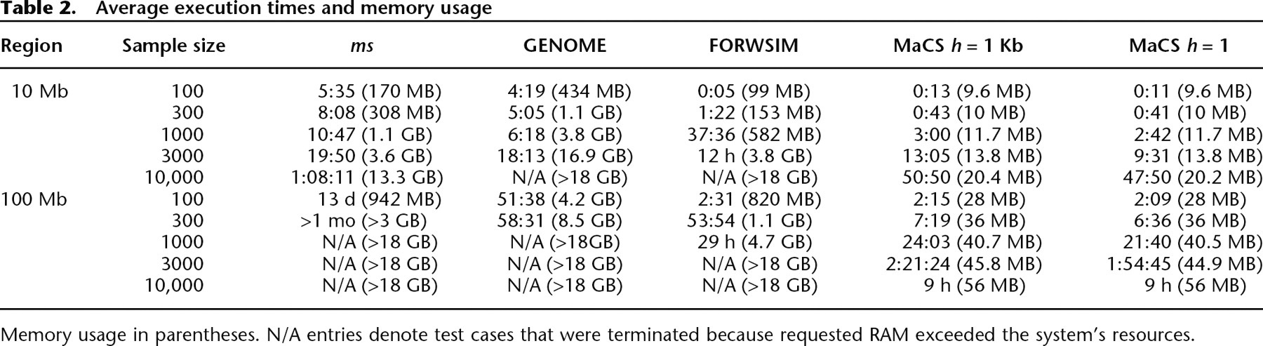 Memory usage in parentheses. N/A entries denote test cases that were terminated because requested RAM exceeded the system’s resources.