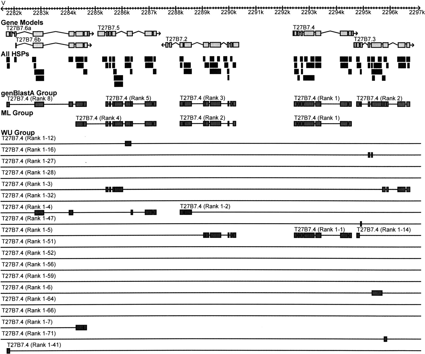 Grouping HSPs into groups representing individual genes. genBlastA was able to resolve all five members, while ML resolved only two and WU only one. Gene models are shown in the Gene Models track. HSPs are shown as blue boxes in the All HSPs track. The color indicates different PIDs for the HSPs. Darker color indicates higher PID. The genBlastA Group, ML Group, and WU Group tracks show HSPs groupings that are returned by genBlastA, ML, and WU-BLAST, respectively.