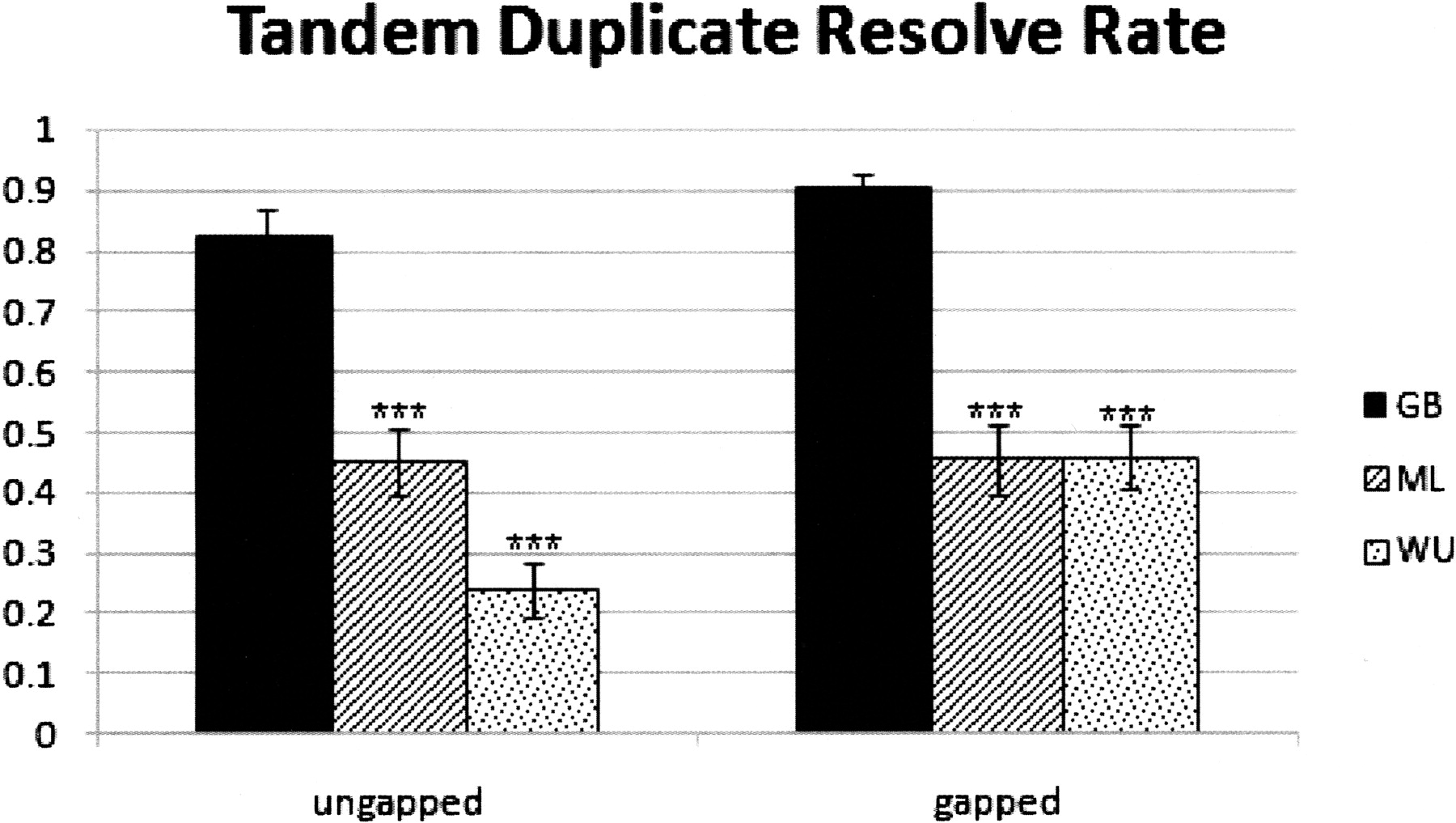 Grouping of HSPs to represent individual homologous genes in tandem clusters. This figure shows average resolve rate for a total of 30 tandem duplicated gene clusters in the EvsE data set for genBlastA (GB), Cui et al. (2007) (ML), and WU-Blast (WU). Ratio of specific groups was calculated as the number of genes resolved over the total number of genes in each tandem gene cluster. A gene is considered resolved if the HSP group overlaps with only one single gene in WormBase and the span similarity is ≥50%. Gapped and ungapped represent two independent BLAST results using either gapped setting or ungapped setting. GB alpha value is 0.5. ML distance threshold is 1000. Error bars, SE. (***) Statistical significance (P < 0.001) by paired Student’s t-test.