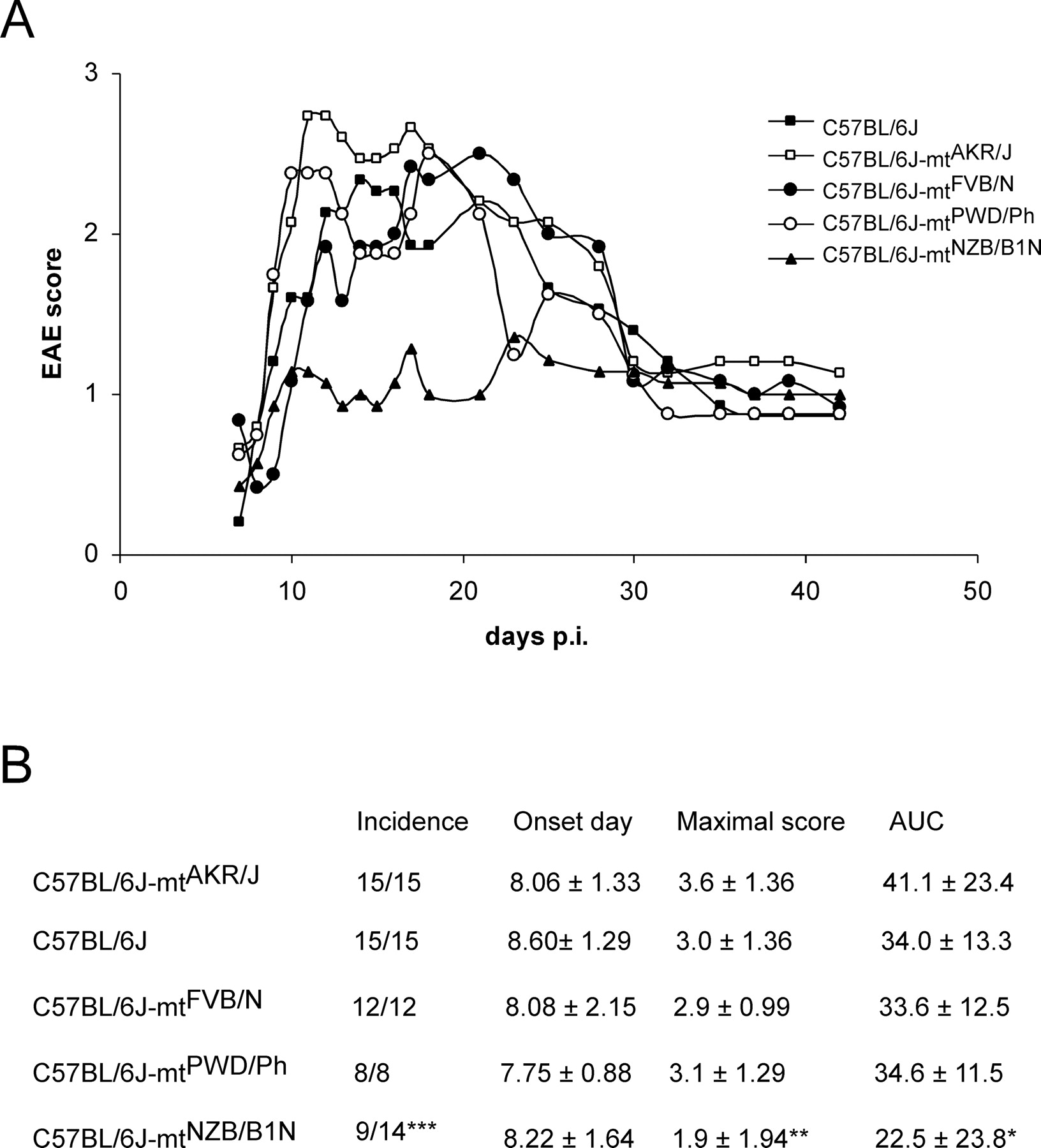 mtDNA variations affect susceptibility to EAE. (A) Development of EAE in five conplastic strains. The x-axis presents the days post-immunization, and the y-axis indicates the EAE score. (B) Comparison of EAE clinical phenotypes, including disease incidence, onset day (only the disease mice were included), maximal disease score, and area under the curve (AUC). The C57BL/6J-mtAKR/J strain was taken as the reference strain, and the statistical significance was calculated for each strain compared with the C57BL/6J-mtAKR/J strain. Asterisks indicate significant differences: *P < 0.05; **P < 0.01; ***P < 0.001.