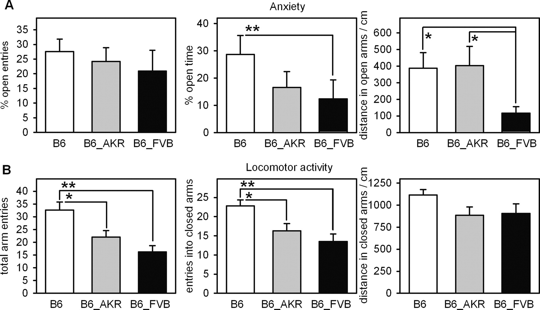 Behavior of C57BL/6J (B6), C57BL/6J-mtAKR/J (B6_AKR), and C57BL/6J-mtFVB/N (B6_FVB) mice on the elevated plus maze. (A) Anxiety was measured by the percentage of entries into open arms, the percentage of time spent in open arms, and the distance walked in open arms. (B) Locomotor activity was recorded as total entries into open and closed arms, the number of times mice entered closed arms, and the distance walked in closed arms. Data represent means and SEM of nine to 12 mice. Asterisks indicate significant differences between strains; : *P < 0.05; **P < 0.01; Mann-Whitney test.