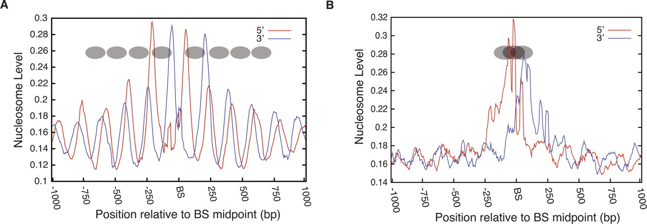 Nucleosomes are strongly positioned at the CTCF-binding sites and the positioning is cell-type-specific. (A) Nucleosomes at the CTCF-binding sites in CD4+ T cells are phased. CTCF binds to the linker region surrounded by well-positioned nucleosomes. The deduced nucleosomes are indicated as ovals. (BS) CTCF-binding site. (B) Nucleosome positions in CD4+ T cells at the HeLa cell-specific CTCF-binding sites. A nucleosome occludes the CTCF-binding site where no binding is detected in CD4+ T cells. The possible nucleosome positions on the CTCF-binding site are indicated as ovals.