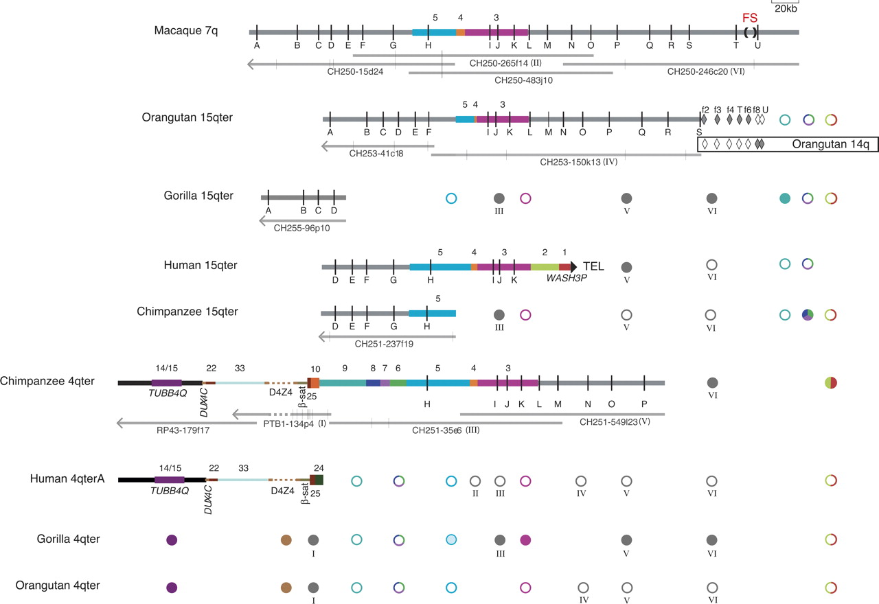 Sequence content of the fission site region of macaque chromosome 7 and chromosomes 15q and 4q subtelomeres in primates, as compiled from sequenced BACs and targeted FISH and PCR assays. The annotated thick horizontal lines indicate sequence contigs derived from non-human BACs or the human genome assembly. The large filled triangle at the right end of human 15q indicates it as the only one of these sequence contigs to reach the terminal telomere-repeat arrays. Vertical black lines represent OR genes identified by letters A–U (see Supplemental Table 6 for official nomenclature for these genes). The fission site (FS), indicated by (), lies between ORs T and U. Colored bars represent sequence blocks known to be subtelomerically duplicated in the human genome (Linardopoulou et al. 2005); blocks 5, 4, and 3 derive from the fission site region. Horizontal gray bars indicate additional sequences orthologous to the rhesus macaque fission-site region. Orange-brown and gray dashes indicate unsequenced D4Z4 arrays in contigs and BAC PTB1-134p4, respectively. Filled or open diamonds indicate PCR assays on flow-sorted orangutan chromosomes 15 or 14 that were positive or negative, respectively (Supplemental Table 3). The spans of the constituent sequenced BACs are indicated by the thin gray lines under each non-human contig; vertical gray lines on these tracks indicate gaps in sequence contigs; left-pointing arrowheads indicate that the BAC sequence extends toward the centromere from portion shown. BACs used for FISH are indicated by roman numerals I–VI in parentheses. Circles summarize the results of FISH assays for sequence whose presence is not already evident from the sequence contigs; filled or open circles indicate the presence or absence, respectively, of a cumulative signal-intensity score at the cytogenetic location exceeding 25% of the maximum cumulative score observed in the experiment (Trask et al. 1998 for block 3; Supplemental Table 2). Note that the presence of a FISH signal does not necessarily mean that the entire probe sequence resides at that location. Gray circles labeled with roman numerals I–VI represent FISH results with BACs constituting the contigs. Colored circles correspond to block-specific FISH probes; multicolored circles indicate that the FISH probe spanned more than one block. Circles for gorilla 4q represent a compilation of FISH results (Supplemental Table 2) and our PCR assays for blocks 9, 8, 7, 6, and 5 sequences in 4q-derived, D4Z4-containing gorilla BACs identified by Bodega et al. (2007) (Supplemental Table 3). The block-5 circle is partially shaded to indicate that gorilla 4q is FISH negative for this sequence, but these gorilla 4q BACs are PCR positive only for the most distal block 5 assays. Note that FISH assays detect the presence/absence, but not the order, of sequences in a given subtelomere. Wherever possible, FISH-result symbols are aligned with the corresponding probe’s sequence in at least one contig; the FISH symbols for blocks 1/2, 9, and 6/7/8 are shown at the far right to indicate that these probe sequences, when detected by FISH, most likely lie telomeric of the sequence in the contigs. The sequence contigs are drawn to scale and aligned to facilitate comparison of their contents: macaque 7q, orangutan 15q, and human 15q contigs are aligned at OR gene I; chimpanzee 15q and 4q are aligned to human 15q at gene H; gorilla 15q is aligned to human 15q at gene D; human 4q is aligned to chimpanzee 4q at TUBB4Q. The diagrams of sequence contigs are truncated at arrowheads just proximal of gene A to exclude a complex region of tandem repeats that proved difficult to align across species, and the diagram for PTB1-134p4, is truncated at an arrowhead to indicate the extent of curated sequence from this BAC.
