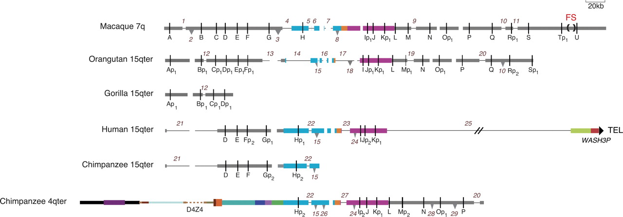 Comparative map of the fission site region and its subtelomeric derivatives drawn to show all post-fission deletions and insertions involving >2.8 kb and OR pseudogenizing events. Thin black lines in the annotated sequence contigs indicate deletion of a sequence that is present in one or more other contigs. Inverted triangles indicate the presence of a sequence that is absent in one or more other contigs; the base of each triangle corresponds to the size of the inserted sequence. The direction of these changes (i.e., deletion vs. insertion) was inferred using parsimony in cases where more than one species shares an alternative structure and/or by examining the state of repeats at the breakpoints (Supplemental Table 4). These changes are numbered from left to right and down the figure; a change shared by more than one species carries the same number. In order to maximally align homologous sequences in the diagram, spaces are placed in contigs lacking each insertion at the position where an insertion is present in one or more other contigs. These spacers are not numbered. Rearrangement number 10 is shown as both insertion and deletion (INDEL), because its direction cannot be inferred from the available sequence. OR pseudogenes are indicated by “p,” and subscript numbers indicate independent or shared deactivating mutations. Not shown is the state of three gorilla OR genes, Ip3, J, and Kp1, which was determined by sequencing PCR products amplified from genomic DNA (Mefford et al. 2001, accession nos. EU685271–EU685273); FISH localizes these single-copy genes to gorilla 4q (Trask et al. 1998). The gorilla genome lacks gene H (Supplemental Table 3). The dashed turquoise bar in the orangutan 15q contig corresponds to a sequencing gap in insertion number 15. See the legend for Figure 2 for an explanation of other features.