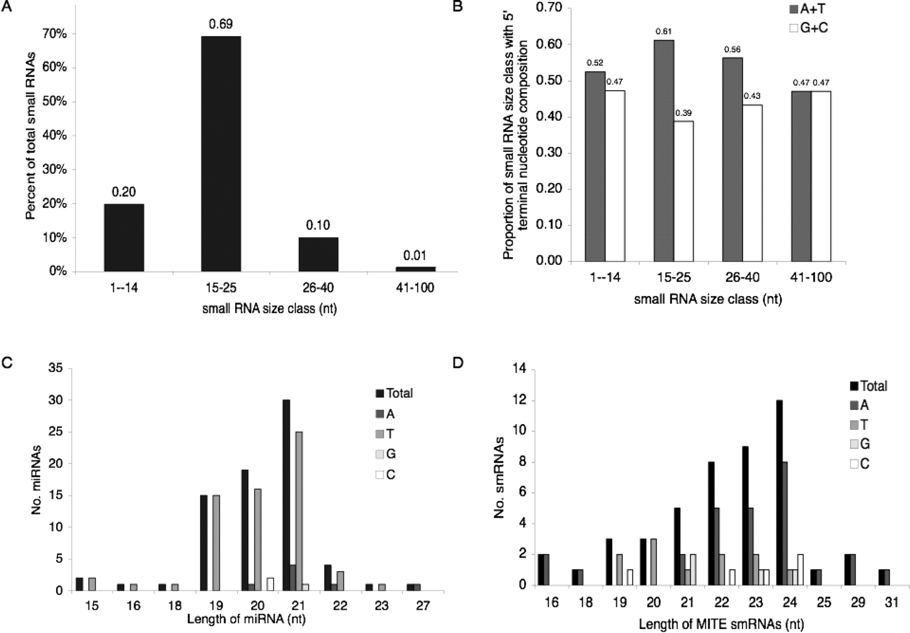 Characteristics of cloned small RNAs. (A) Length distribution of small RNAs of the total S. demissum data set (4421 smRNAs). (Black bars) Indicate the percentage of small RNAs in each size class among the total data set. (B) Proportion of the total S. demissum small RNAs within each of the four size classes with A or T or G or C as the 5′-terminal nucleotide. Within each size class, (gray bar) the portion of small RNAs with a 5′-terminal A or T; (white bars) the portion with a 5′-terminal G or C. (C) Size distribution and 5′-terminal nucleotide composition of miRNAs ranging from 15 to 27 nt in length. (Black bar) The total number of cloned miRNA in each size class. The number of miRNAs with a 5′ (dark gray bar) A, (gray bar) T, (light gray bar) G, or (white bar) C residue. (D) Size distribution and 5′-terminal nucleotide composition of MiS small RNAs ranging from 15 to 31 nt in length. The 5′ nucleotide composition is indicated as in C.