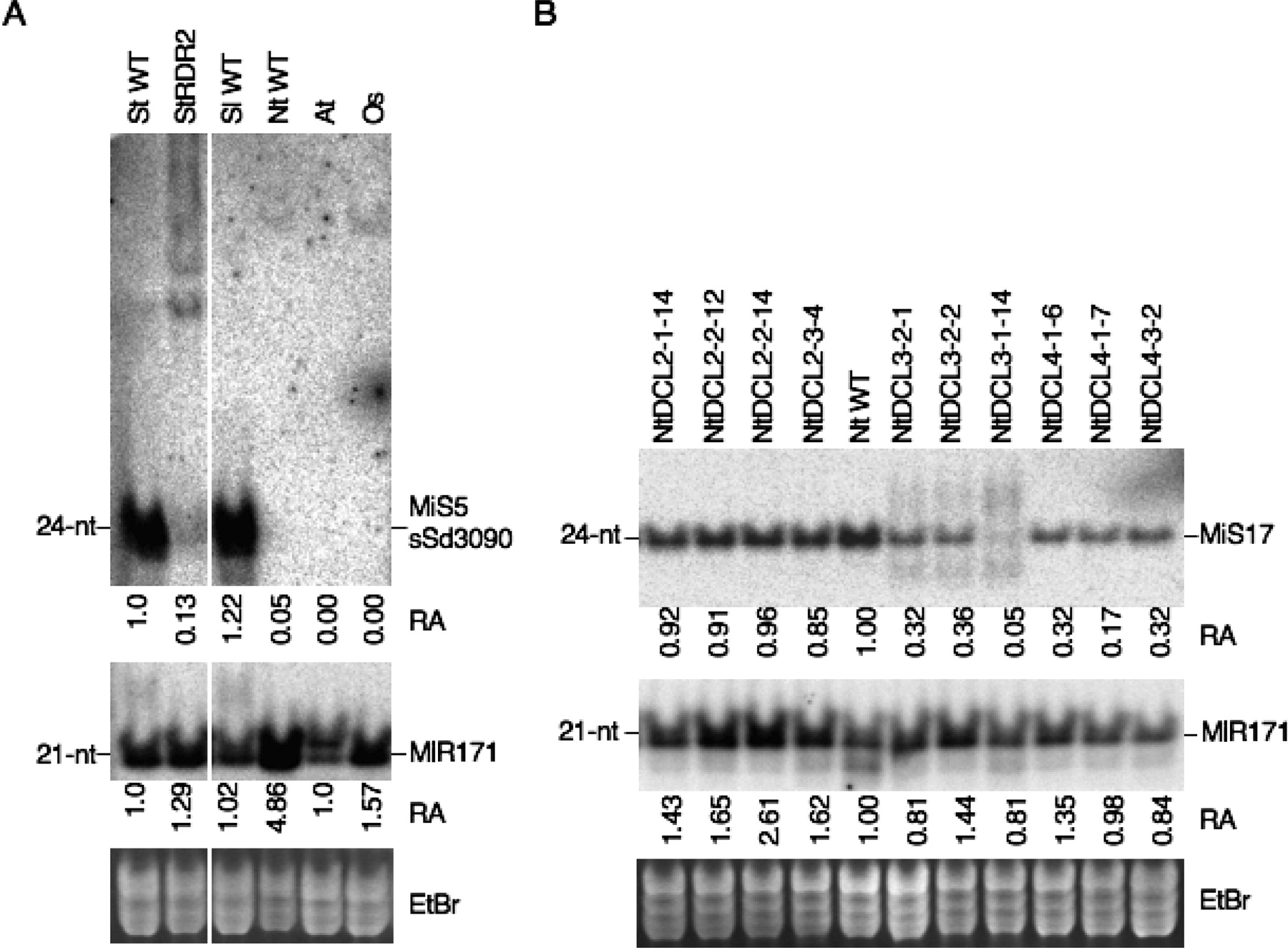 RNA-dependent RNA polymerase (RDR2) and DICER-LIKE (DCL) are involved in the biogenesis of MiS small RNAs. Small RNA-enriched fractions isolated from wild type and RNAi lines were prepared and analyzed by Northern blot hybridization as described in Figure 3. Blots were hybridized with MiS and miRNA probes (see Supplemental Table S3.2 for a description of probes). (A) Detection of MiS5 (Sd3090 probe) small RNA and MIR171 in (St WT) wild-type S. tuberosum Katahdin; (St rdr2) S. tuberosum Katahdin RDR2 RNAi line; (Sl WT) wild-type S. lycopersicum VF36; (Nt WT) wild-type N. tabacum SR1; (At) wild-type Arabidopsis Col; and (Os) wild-type Oryza sativa Nipponbare. (B) Detection of MiS17 plus strand small RNA and MIR171 in wild-type tobacco SR1 and N. tabacum RNAi lines targeting (DCL2) DCL2-1, DCL2-2, and DCL2-3; (DCL3) DCL3-2 and DCL3-2; and (DCL4) DCL4-1 and DCL4-3 (for construction and characteristics of tobacco RNAi lines, see Supplemental Figs. S2.1 and S2.2; Supplemental Tables S4.1–S4.4). (A,B, bottom panels) The ethidium bromide (EtBr) staining of gels as loading controls. The numbers below the hybridization panels in A and B indicate the relative abundance (RA) of siRNA detected by Northern blot hybridization in each sample compared to StWT in A and NtWT in B. Relative siRNA abundance has been normalized (WT = 1.0) according to EtBr staining of gels in A and B.
