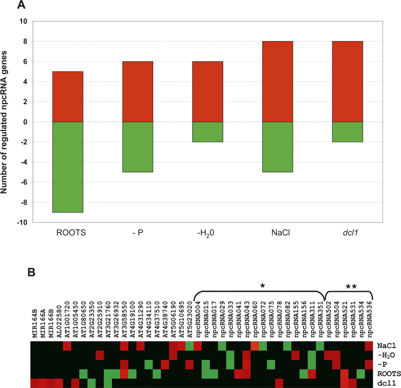 Regulation of genes in the RIBOCHIP. (A) Total number of genes that were either induced (red bars) or repressed (green bars) in each analyzed condition. Conditions include expression in roots versus leaves (roots), roots of phosphate starved plants (−P), plants under water stress (−H2O), roots of plants treated with 150 mM NaCl (NaCl), and inflorescences of dcl1-9 mutants (dcl1). (B) Heat map showing expression level of each individual gene summarized in A. (*) npcRNAs identified by Hirsch et al. (2006); (**) npcRNAs identified in this study. Genes without asterisks correspond to additional regulated genes from the RIBOCHIP (annotation is indicated: coding sense counterparts of npcRNAs, RNA-binding proteins, miRNA precursors, and control genes).