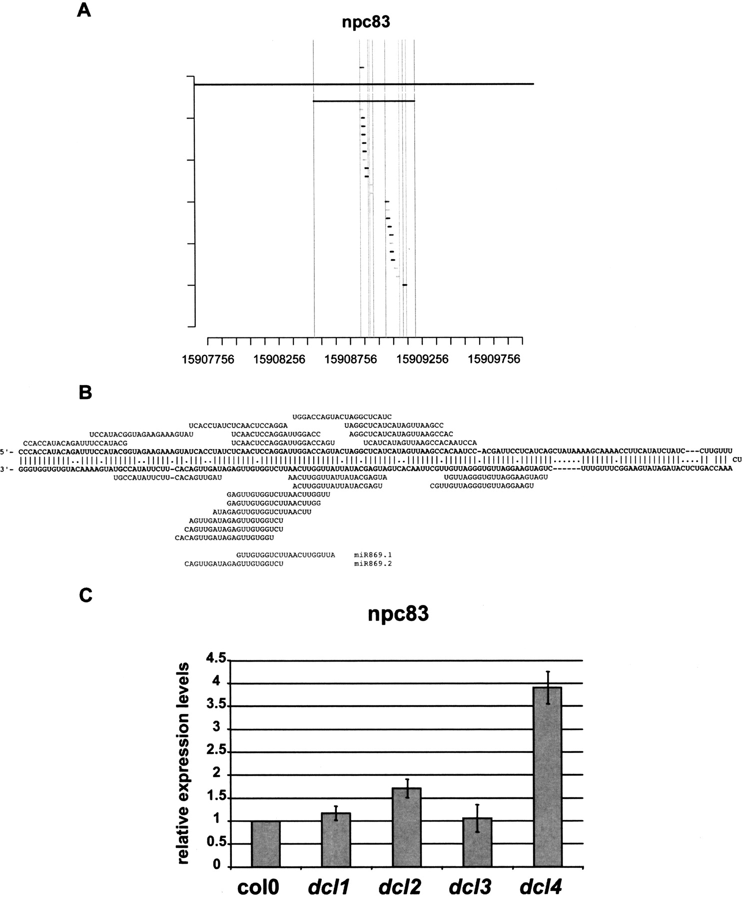The npc83 is the miR869A precursor and is up-regulated in dcl4 mutants. The npc83 transcript encodes several small RNAs, notably miR869 (A), that are produced from a highly stable RNA-secondary stem structure (Z-score = 16). The position of the miRNA and detected siRNAs on the stem-loop of this npcRNA is indicated in B. (C) Expression of the MIR869A precursor was analyzed in dcl1-9, dcl2, dcl3, and dcl4 mutants and Col-0 seedlings by real-time RT-PCR. Data was normalized with ACT2 (AT3G18780), and values for Col-0 were arbitrarily fixed to 1. Two biological replicates gave similar results, and a representative example (SDs of technical replicates) is shown.