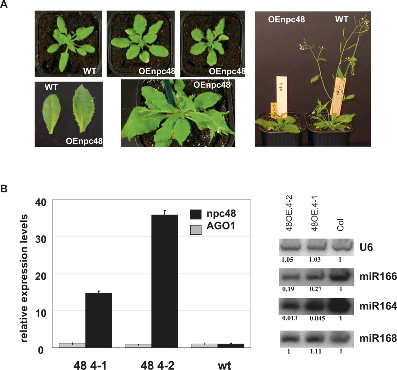 Phenotypic and molecular analysis of transgenic plants overexpressing npc48. (A) Phenotype of Arabidopsis plants transformed with 35S∷npc48 construct. A wild-type (WT) plant (left) and two representative T1 35S∷npc48 plants (OEnpc48) from independent lines displaying a characteristic serrated leaf phenotype at different growth stages (central photos) are shown. Rosette leaves from WT and OEnpc 48 plants (lower left panel). Image of whole plants (right panel) illustrates the delayed flowering of OEnpc48 plants. (B) Expression analysis of npc48 and AGO1 mRNA from leaves of two npc48 overexpressing lines and control WT using real-time RT-PCR (left panel). Northern blot analyses of miR164, miR166, miR168, and U6 RNAs (right panel). Quantification is indicated setting the Col-0 value arbitrarily to 1 and normalizing to U6 values.