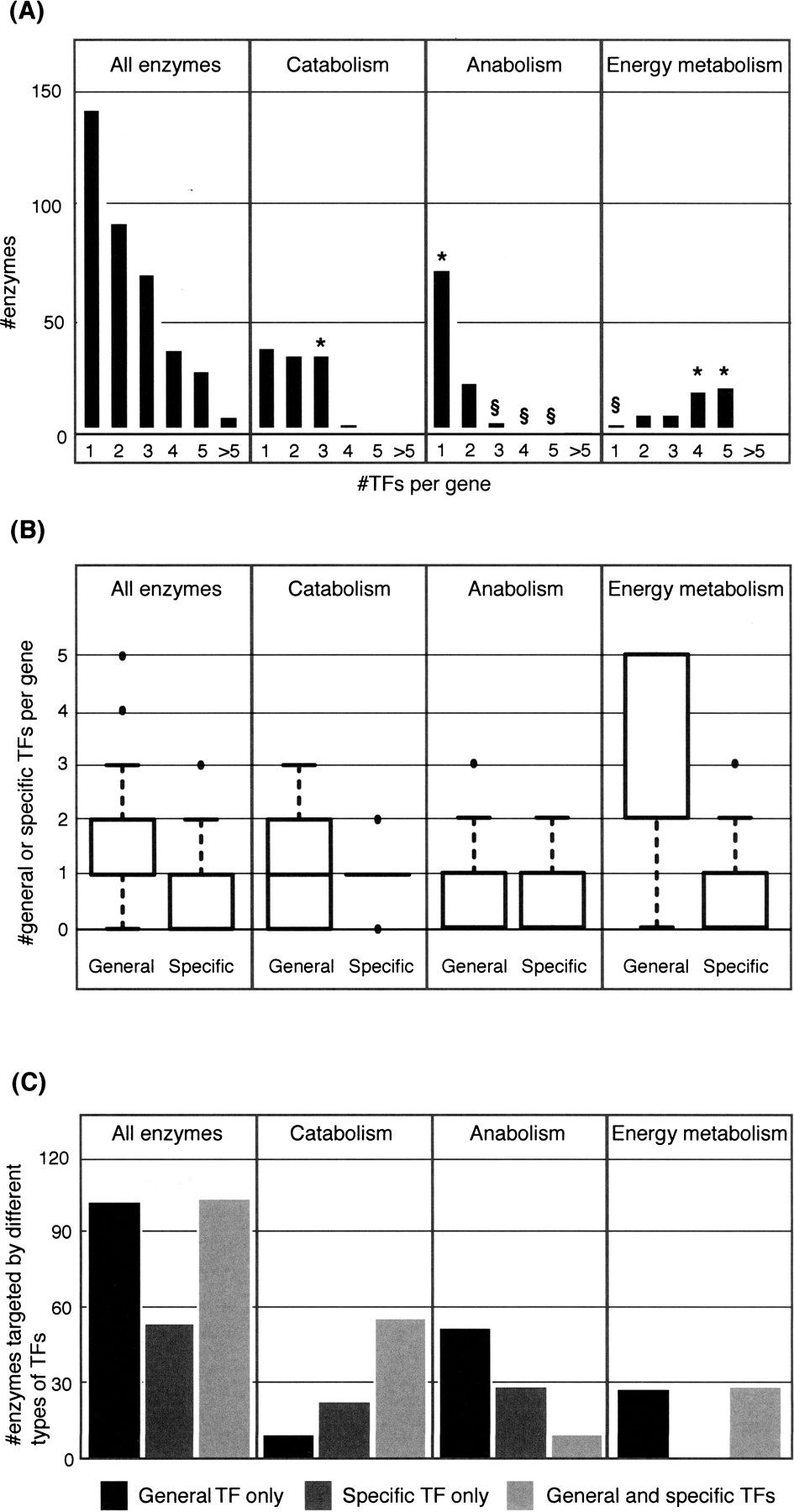Numbers of TFs controlling metabolic enzymes. (A) Histogram of numbers of TFs regulating all, catabolic, anabolic, and central energy enzymes. (*) Overrepresented groups; (§) underrepresented groups. (B) Box plots of numbers of general and specific TFs targeting different classes of enzymes. (C) Histogram of numbers of enzymes regulated by general TFs only, specific TFs only, and combinations of general and specific TFs.