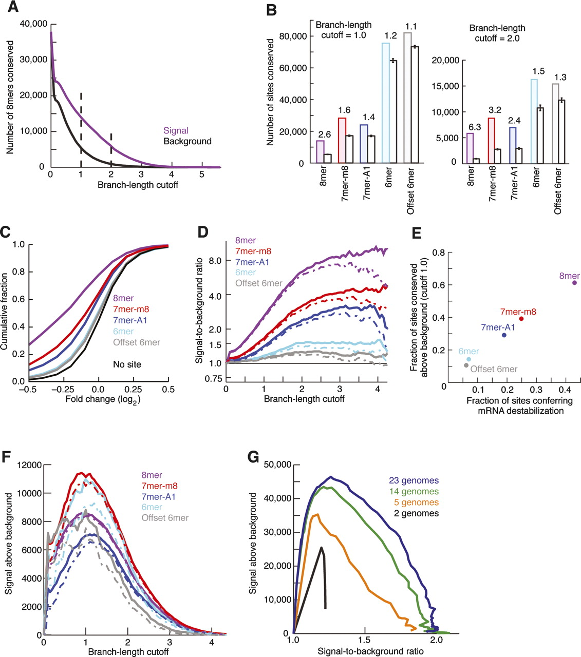Conservation of major seed-match types. (A) Conservation of 8mer sites for 87 broadly conserved miRNA families. High-sensitivity and high-specificity cutoffs are highlighted with broken lines at 1.0 and 2.0, respectively. (B) Conservation and background estimate for mutually exclusive site types at high sensitivity (left) and high specificity (right). The signal-to-background ratio is indicated above the pair of bars. Error bars indicate one standard deviation in the estimated background, based on subsampling of individual control k-mers. (C) Efficacy of offset 6mer sites. Microarray data monitoring mRNA destabilization following transfection of 11 miRNAs was analyzed as described previously (Grimson et al. 2007). Shown is the cumulative distribution of changes for transcripts containing exactly one offset 6mer site and no other canonical sites in their 3′UTR. For comparison, previously reported analyses of messages with single canonical sites are also shown (Grimson et al. 2007). (D) Signal-to-background ratio for indicated sites at increasing branch-length cutoff. Broken lines indicate 5% lower confidence limit (z-test). (E) Correlation of site conservation rate and experimental efficacy. Fraction of sites conserved above background was calculated as ([Signal – Background]/Signal) at a branch-length cutoff of 1.0. The minimal fraction of sites conferring destabilization was determined from the cumulative distributions (C), considering the maximal vertical displacement from the no-site distribution (correcting for the bumpiness of the distributions as described previously [Grimson et al. 2007]). (F) Estimates of signal above background for the major site types. Broken lines indicate 5% lower confidence limit (z-test). (G) Aggregate conservation above background for all major site types when using using subsets of genomes. To facilitate overlay of the plots, the X-axis is signal-to-background ratio rather than branch-length cutoff. The 14-genome subset represents the non-fish species originally available in the UCSC 17-way alignments. The five-genome subset contains human, mouse, rat, dog, and chicken, and the two-genome subset contains only human and mouse.