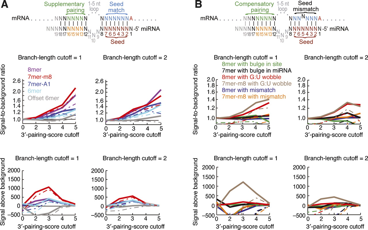 Conserved pairing to the 3′ ends of miRNAs. (A) Preferential occurrence of pairing to the 3′ region of the miRNA, which can supplement canonical sites (diagrammed at top). Signal-to-background ratio (top two graphs) and signal above background (bottom two graphs) are plotted at conservation branch-length cutoffs of 1.0 (left) and 2.0 (right). Five percent confidence limits are shown as dashed lines. (B) Preferential occurrence of pairing to the 3′ region of the miRNA, which can compensate for mismatches or bulges in seed pairing (diagrammed at top). As in A, except that seed matches were replaced as indicated with sites containing a mismatched, G:U wobble, or bulged nucleotide.