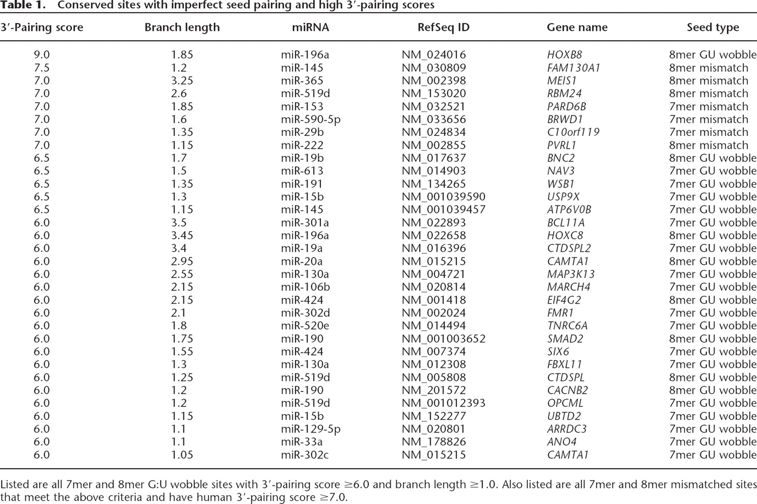 Listed are all 7mer and 8mer G:U wobble sites with 3′-pairing score ≥6.0 and branch length ≥1.0. Also listed are all 7mer and 8mer mismatched sites that meet the above criteria and have human 3′-pairing score ≥7.0.