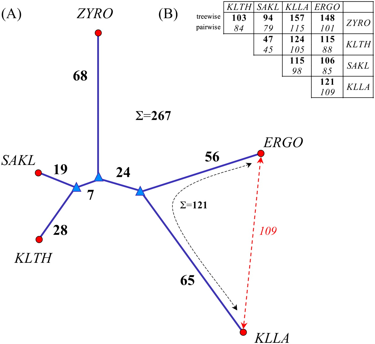 Genome rearrangements. (A) Minimum rearrangement tree computed using the FAUCILS stochastic local search method (Goëffon et al. 2008); (●) contemporary genomes; (▲)inferred ancestral genomes; bold figures show the number of rearrangements in this minimum tree. (B) Contrast between rearrangement distances summing the branches in the tree (in bold, upper row), and pairwise distances (in italics, lower row) computed using the GRIMM method (Tesler 2002). Note that the requirement of going through a common ancestor usually increases treewise distances compared to pairwise distances owing to the triangle inequality, but decreases the sum of distances for the entire tree when all genomes are taken into account. This is illustrated in A for the pair ERGO and KLLA, Σ = 121 > 109, while the overall sum for the tree is 267. The rearrangement tree independantly corroborates the phylogenetic tree calculated using sequence similarity (see Discussion).