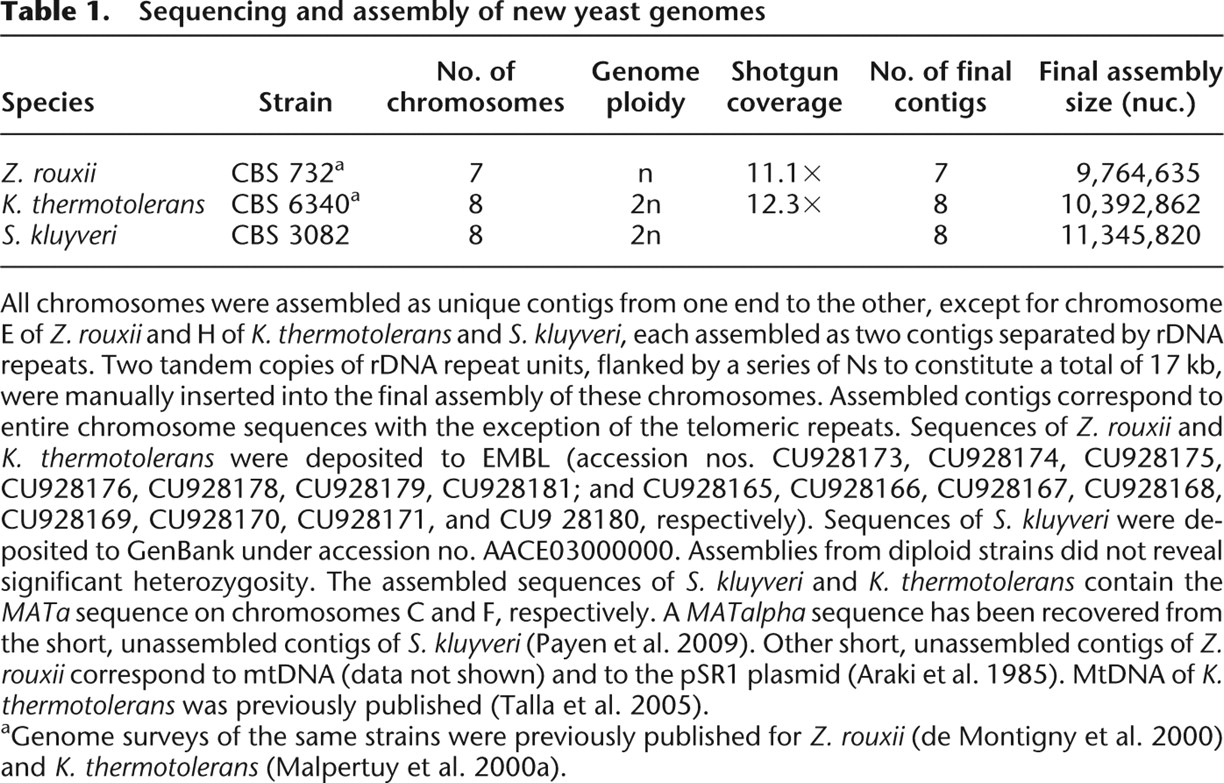 All chromosomes were assembled as unique contigs from one end to the other, except for chromosome E of Z. rouxii and H of K. thermotolerans and S. kluyveri, each assembled as two contigs separated by rDNA repeats. Two tandem copies of rDNA repeat units, flanked by a series of Ns to constitute a total of 17 kb, were manually inserted into the final assembly of these chromosomes. Assembled contigs correspond to entire chromosome sequences with the exception of the telomeric repeats. Sequences of Z. rouxii and K. thermotolerans were deposited to EMBL (accession nos. CU928173, CU928174, CU928175, CU928176, CU928178, CU928179, CU928181; and CU928165, CU928166, CU928167, CU928168, CU928169, CU928170, CU928171, and CU9 28180, respectively). Sequences of S. kluyveri were deposited to GenBank under accession no. AACE03000000. Assemblies from diploid strains did not reveal significant heterozygosity. The assembled sequences of S. kluyveri and K. thermotolerans contain the MATa sequence on chromosomes C and F, respectively. A MATalpha sequence has been recovered from the short, unassembled contigs of S. kluyveri (Payen et al. 2009). Other short, unassembled contigs of Z. rouxii correspond to mtDNA (data not shown) and to the pSR1 plasmid (Araki et al. 1985). MtDNA of K. thermotolerans was previously published (Talla et al. 2005).