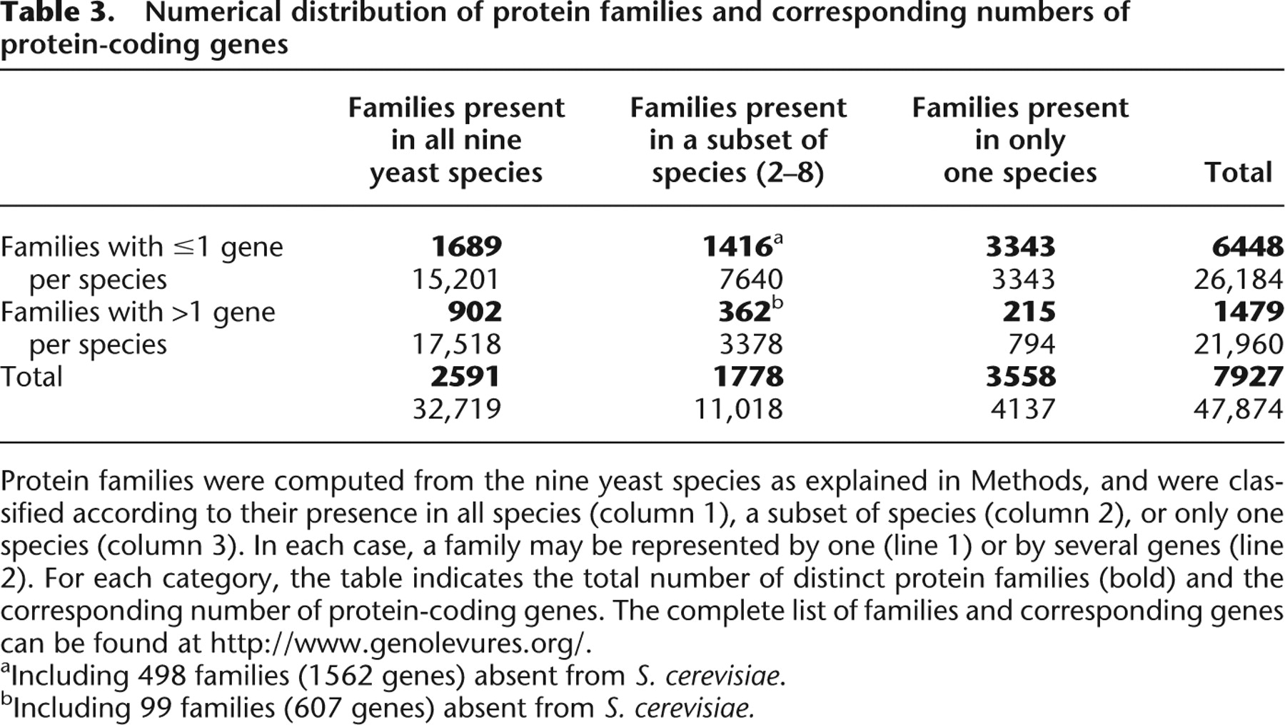 bIncluding 99 families (607 genes) absent from S. cerevisiae.