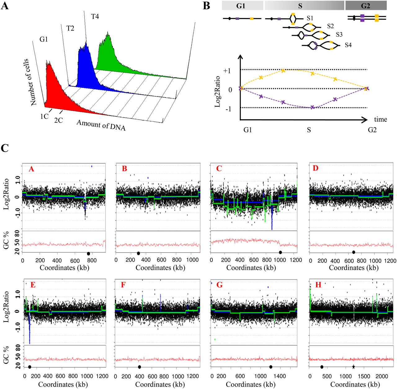 Replication timing in L. kluyveri. (A) Flow cytometry. Samples of synchronized cells were collected in G1 arrest (red) and in two points (T2 in blue and T4 in green) of the S phase spaced by 5 min. (1C, 2C) DNA content. (B) Schematic representation of the replication of a theoretical chromosome. (Yellow boxes) Early replicated regions, (violet boxes) late replicated regions. In G1, the yellow and violet regions are present in one copy. During the S phase (S1–S4), the copy number of the different cassettes increases to reach two copies in G2. The log2 ratio of the DNA content for the early (yellow) and late (violet) regions are represented according to the time from the G1 to the G2 phases. In G1, the log2 ratio is zero. At the beginning of the S phase, the regions replicated early (yellow box) are present in two copies, while the other regions are just in one copy. Thus, the log2 ratio of the yellow box tends to one, while the log2 ration of the violet box decreases. Later in the S phase, the different parts of the genome replicate until all are present in two copies, and finally in G2 the relative ratio of the intensity tends again to zero. (C) Replication profiles of the chromosomes and their GC content. Microarrays were cohybridized with the DNA from cells arrested in G1 and DNA from cells in T2 or T4 (see Methods). The ratio of the intensities of the two fluorochromes is computed and the log2 ratios are plotted according to the physical position of their corresponding sequences on the different chromosomes (A–H in red, rDNA locus ignored). The curves in blue (T2 vs. G1) and in green (T4 vs. G1) are calculated using a segmentation method for array CGH data analysis (Picard et al. 2007). The peaks underline overrepresented regions corresponding most likely to replication origins. Note that the C-left region is clearly underrepresented, suggesting that the replication of C-left is delayed compared with the rest of the genome, which is almost entirely replicated. (Black circles) Position of the centromeres, (black star) position of the rDNA.