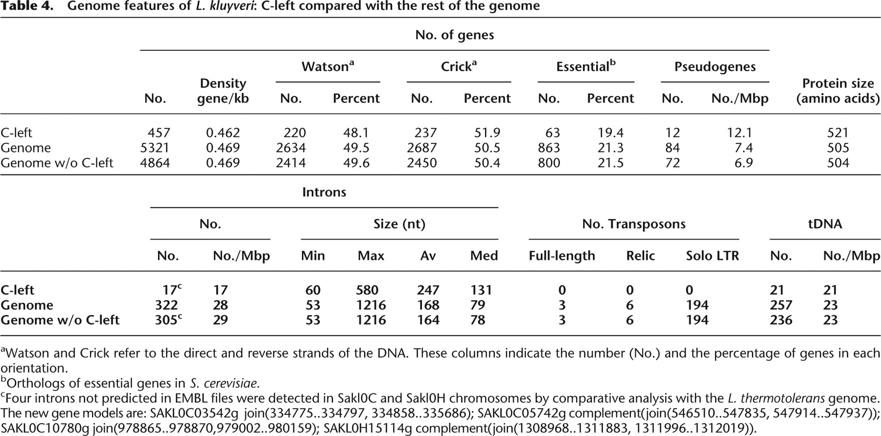 Genome features of L. kluyveri: C-left compared with the rest of the genome