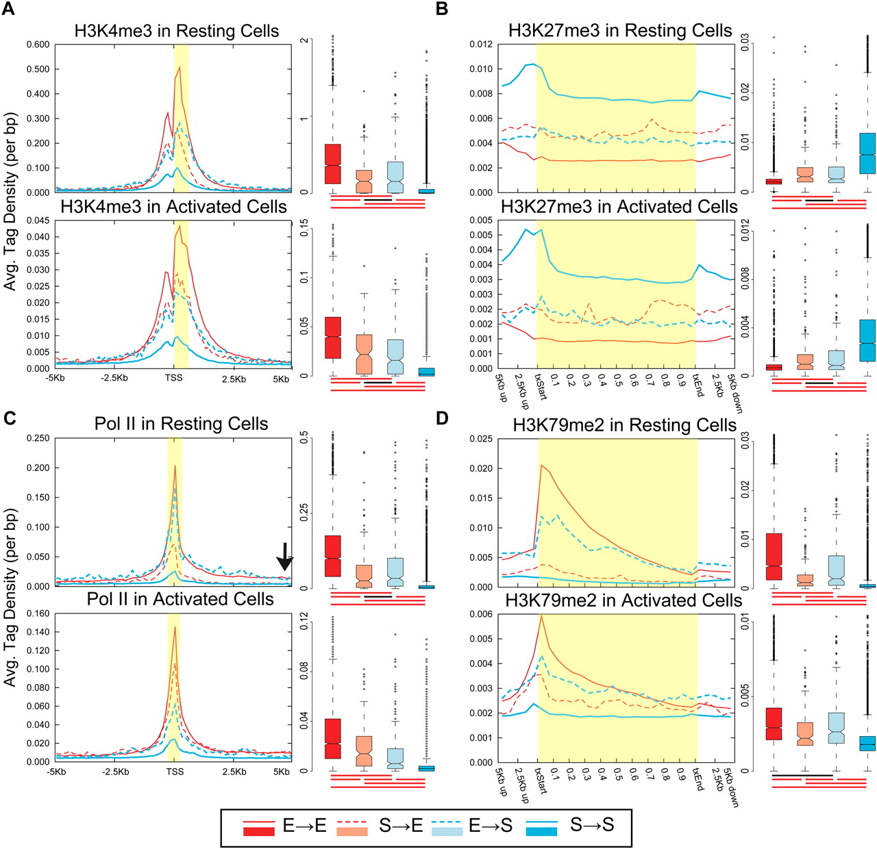 A majority of the genes do not change their chromatin status upon induction or silencing. Average ChIP-seq tag density for the four gene sets are shown in resting (top panel) and activated (bottom panel) CD4+ T cells. The four gene sets: S→E (silent in resting and expressed in activated T cells), red dashed line in density plot and light red in box plot; E→S, blue dashed line and light blue; E→E, red line and red; S→S, blue line and blue. The average tag density values for resting and activated cells are not directly comparable as they have not been normalized across samples. Box plot summarizes the distribution of the number of tags in the region of interest (highlighted in yellow) for each gene set. Box plot captures the median, the middle 50% of the data points, and the outliers. The data points for each gene set are divided into quartiles, and the interquartile range (IQR) is calculated as the difference between the first and the third quartiles. The filled box denotes the middle 50% of the data points, with the horizontal line in-between and the notch representing the median and confidence intervals, respectively. Data points more than 1.5 times IQR lower or higher than first or third quartiles, respectively, represent outliers and are shown as dots. The horizontal line connected by vertical dashed lines above and below the filled box (whiskers) represents the largest and the smallest nonoutlier data points. The cluster of horizontal red and black lines below each box plot signifies whether or not the difference between the medians of two gene sets are statistically significant, respectively (P < 0.01; two-tailed Wilcoxon rank-sum test). (A) H3K4me3, (B) H3K27me3, (C) Pol II, and (D) H3K79me2. Profiles for other modifications are presented in Supplemental Figures S3 and S4.