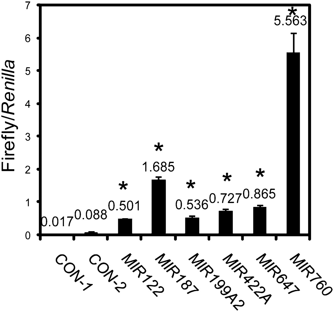 Promoter-reporter assay. Predicted miRNA promoters or control sequences were cloned into pGL3 enhancer vector containing SV40 enhancer, but no promoter. Plasmids were transfected into Jurkat cells together with Renilla luciferase control. Luciferase activity was measured after two days. Ratio of firefly and Renilla luciferase signal + SD (n = 3) is shown. *P-value < 0.005 in Student t-tests vs. both controls 1 and 2.