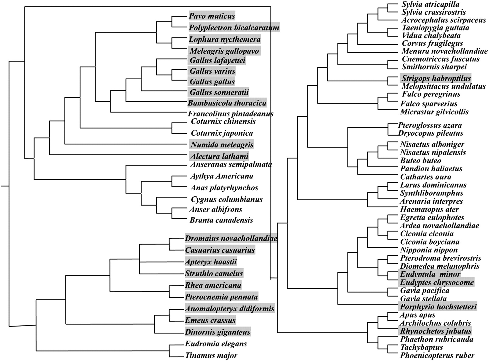 Avian phylogenetic tree reconstructed from mtDNA data. A phylogenetic tree of 76 avian species was constructed from all 13 protein-coding genes from mtDNA genomes using the maximum likelihood method. Flightless birds are marked in gray.