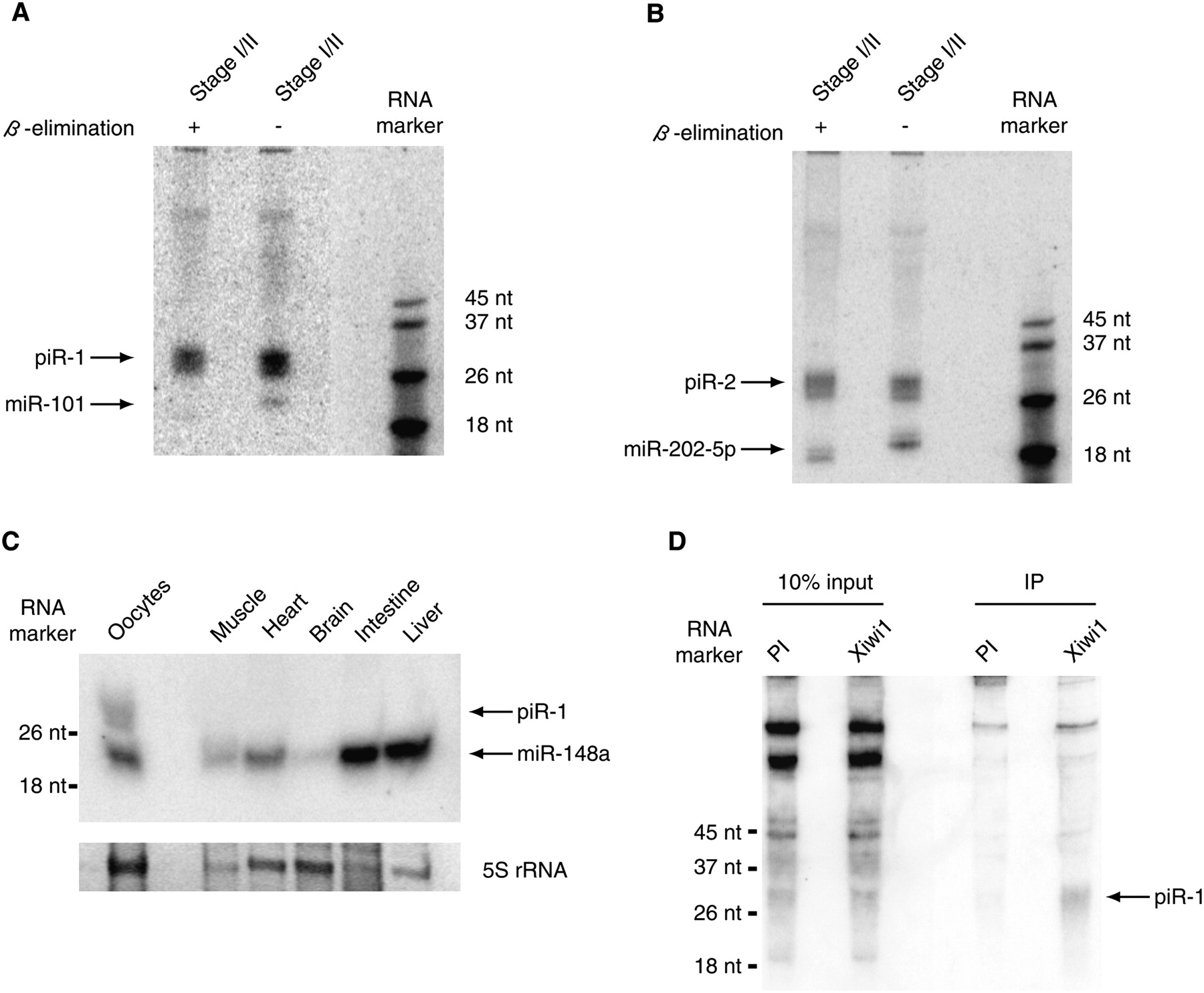 (A) piRNA piR-1 (5′-TGAAGACGGACAGAAGATGGGTTAATTATTT-3′) expression was validated using Northern blotting of early stage oocytes (stages I and II). One hundred and fifty oocyte equivalents were used to analyze small RNA expression. A miR-101 probe was used as a control. β-Elimination was performed to assay for 2′O-methyl-modified 3′ nucleotides. EDC was used to crosslink small RNAs to the membrane prior to hybridization. (B) Experiments were performed as in A, but with probes for piR-2 (5′-TGAATTGTAGAACAATGTACAGGTACACCAT-3′) and miR-202-5p. (C) Expression of piR-1 and miR-148a was assessed in a number of adult somatic tissues and early stage oocytes (stages I and II) using Northern blotting. Ten micrograms of total RNA were used for each lane. 5S rRNA is shown as a loading control. (D) Northern blot analysis of immunoprecipitated piRNAs using piwil1.1/piwil1.2 specific antibody (PI: pre-immune).