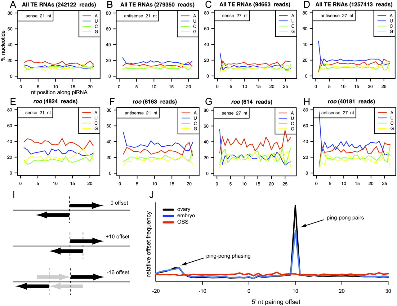 Sequence properties of TE-siRNAs and TE-piRNAs in OSS cells. (A–D) Aggregate nucleotide composition of all TE-derived reads of length 21 nt (siRNA) or 27 nt (as a representative piRNA size); in all graphs, the x-axis represents nucleotide position along the piRNA, while the y-axis represents the percent nucleotide composition and each position. 5′ U bias is observed for bulk AS-TE-siRNAs as well as S- and AS-TE-piRNAs, but is lacking in bulk S-TE-siRNAs. Note also that S-TE-piRNAs lack any bias for adenine at position 10 (above the adenine bias of neighboring nucleotide positions), as would be expected for ping-pong pairs. Analysis of other TE read sizes are available in Supplemental Figure S3. (E–H) Specific analysis of roo reads shows similar trends. Analysis of all other individual TEs are available in Supplemental Figure S4. (I) Overlap analysis of piRNAs with three hypothetical configurations of distance between 5′ ends of a piRNA and its nearest neighbor on the opposite strand; +10 offset is typical of piRNA ping-pong, while −16 offset is consistent with a phased arrangement of ping-pong pairs (gray arrows depict “missing” piRNAs). (J) Analysis of ovary (black) and 0–2-h embryo (blue) piRNAs reveals strong ping-pong (+10 offset pairs) and modest evidence for a phased ping-pong pairs. No ping-pong is observed for OSS piRNAs (red).