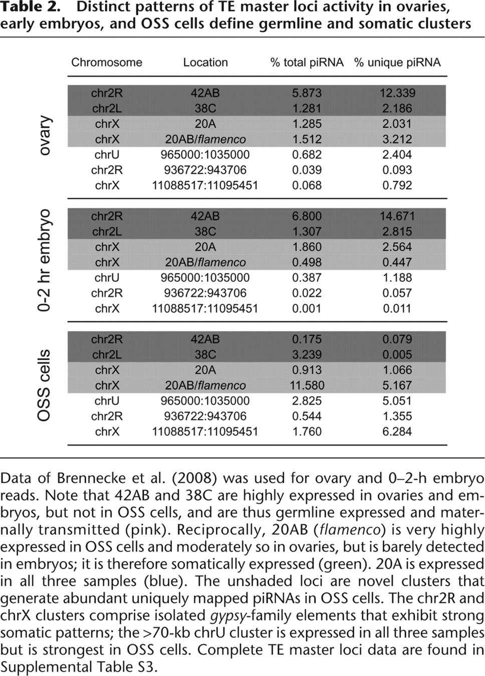 Data of Brennecke et al. (2008) was used for ovary and 0–2-h embryo reads. Note that 42AB and 38C are highly expressed in ovaries and embryos, but not in OSS cells, and are thus germline expressed and maternally transmitted (pink). Reciprocally, 20AB (flamenco) is very highly expressed in OSS cells and moderately so in ovaries, but is barely detected in embryos; it is therefore somatically expressed (green). 20A is expressed in all three samples (blue). The unshaded loci are novel clusters that generate abundant uniquely mapped piRNAs in OSS cells. The chr2R and chrX clusters comprise isolated gypsy-family elements that exhibit strong somatic patterns; the >70-kb chrU cluster is expressed in all three samples but is strongest in OSS cells. Complete TE master loci data are found in Supplemental Table S3.