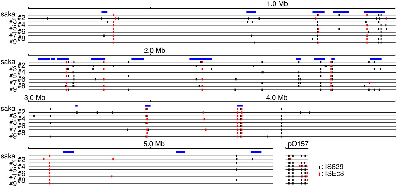 Distribution of IS629 and ISEc8 in the nine O157 genomes used in this study. The locations of IS629 and ISEc8 elements on each chromosome and plasmid are shown. (Black vertical lines) Insertion sites for IS629; (red lines) insertion sites for ISEc8; (blue rectangles) regions corresponding to prophages and phage-like integrative elements.