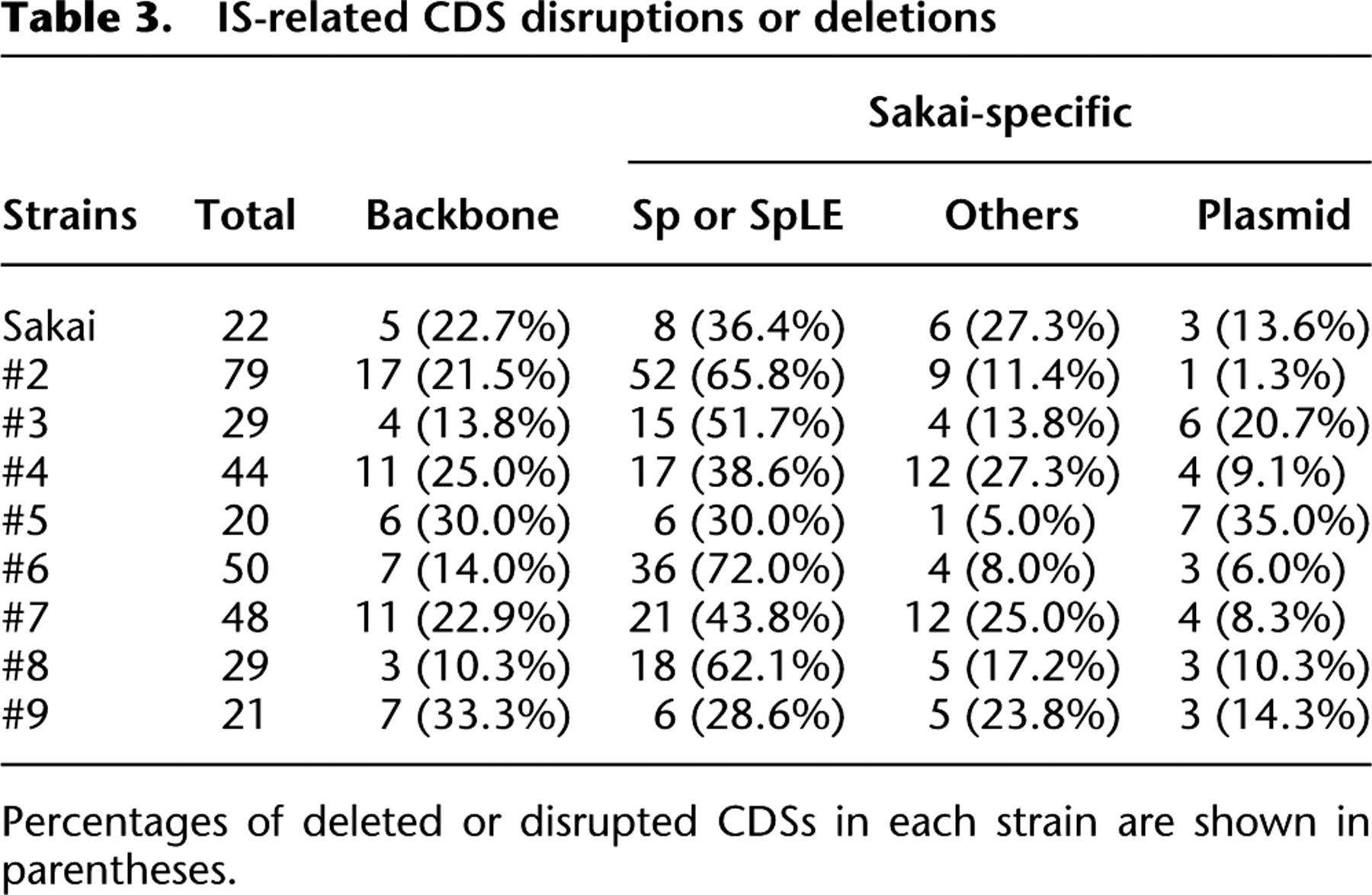 Percentages of deleted or disrupted CDSs in each strain are shown in parentheses.