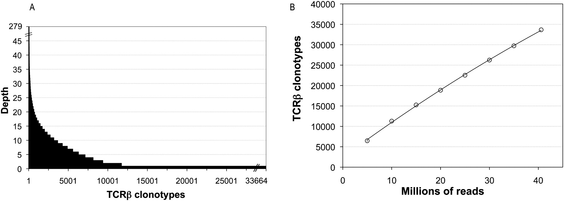 (A) TCRβ diversity. A total of 33,664 TCRβ clonotypes were identified from complete and in-frame CDR3β sequences assembled by iSSAKE. Clonotypes with a copy number of one (clonotypes identified by a single iSSAKE contig) account for 65.3% of all clonotypes. Clonotypes identified by two to 19 iSSAKE contigs account for 32.6% of all clonotypes, and high-abundance clonotypes (contig depth ≥20) account for 2.1% of the total. (B) Saturation analysis. In duplicate experiments we chose independent sets of 5, 10, 15, 20, 30, and 35 M reads at random from the pool of 40,582,229 total sequence reads in our data set. These subsets of reads were assembled and clonotypes counted as the set of complete, in-frame, nonredundant CDR3β sequences. The number of clonotypes (mean ± SD for the duplicate experiments) is plotted as a function of the number of reads. Error bars are contained within the symbols.