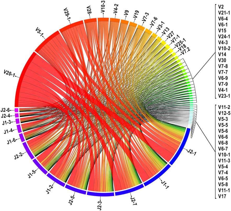 Frequencies of V-J pairing calculated from the subset of clonotypes with an unambiguous TRBV gene segment assignment (n = 22,704). (Blue to purple rectangular bands) TRBJ segments, (red to cyan rectangular bands) TRBV segments. The width of the bands is proportional to the number of times the TRBV and TRBJ genes connected by the band co-occur in CDR3β sequences. TRBV and TRBJ segments are arranged from left to right and right to left, respectively, and ordered by total pairing links they share. (This illustrates the data contained in Supplemental Table 1.) This figure was generated using the Circos software package (Krzywinski et al. 2009).