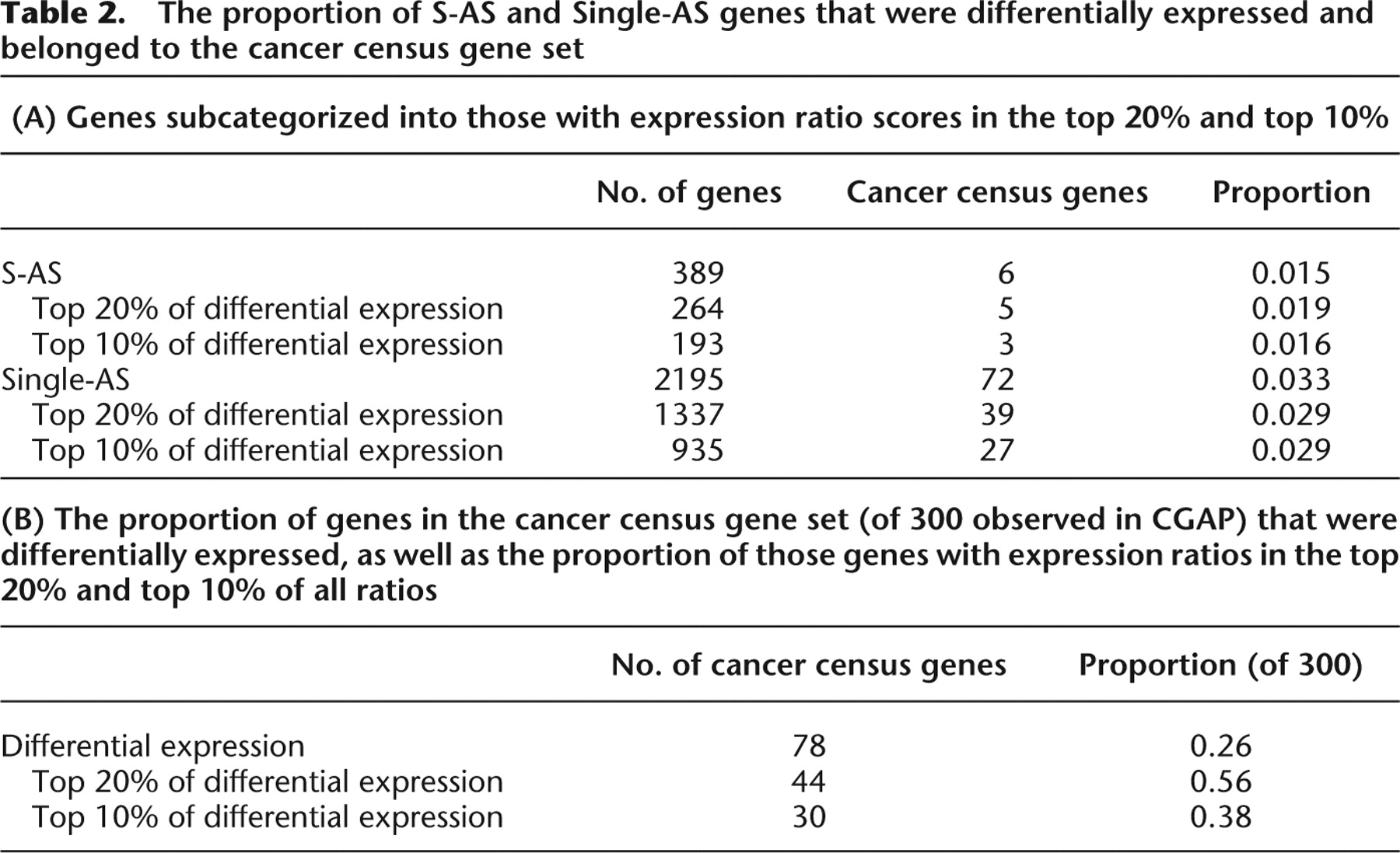The proportion of S-AS and Single-AS genes that were differentially expressed and belonged to the cancer census gene set