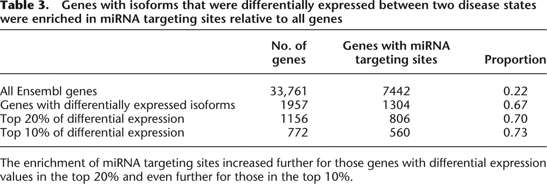 Genes with isoforms that were differentially expressed between two disease states were enriched in miRNA targeting sites relative to all genes