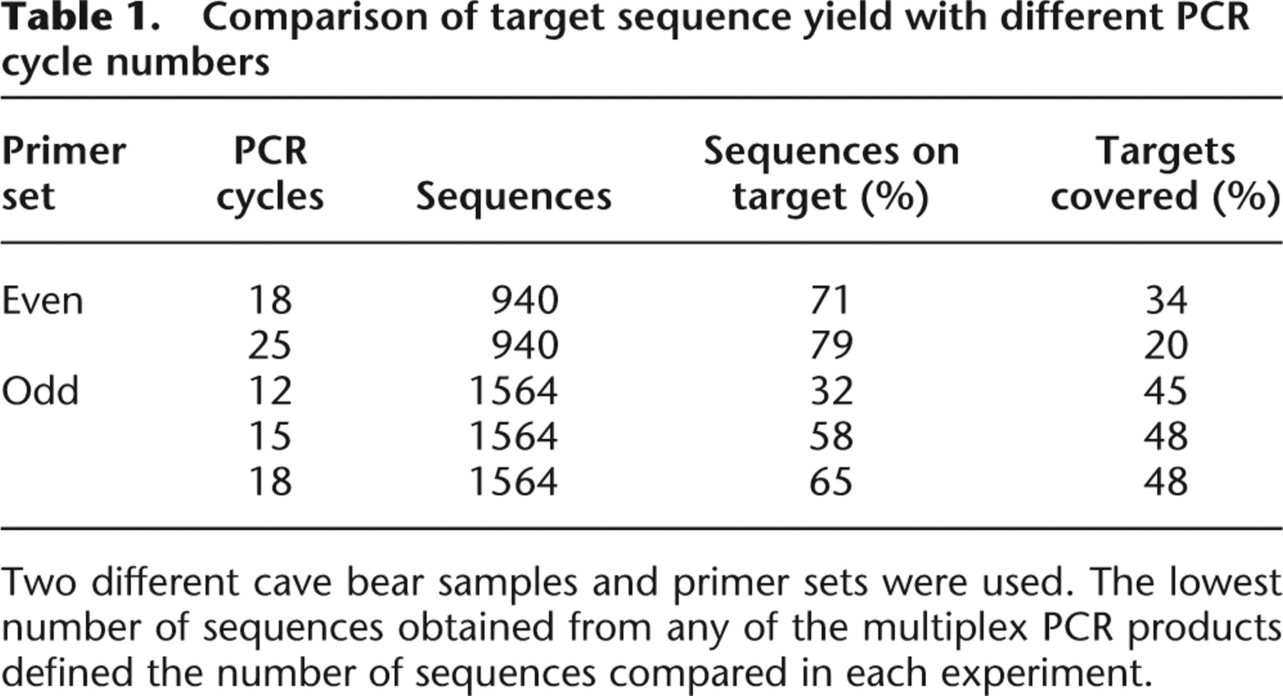 Two different cave bear samples and primer sets were used. The lowest number of sequences obtained from any of the multiplex PCR products defined the number of sequences compared in each experiment.