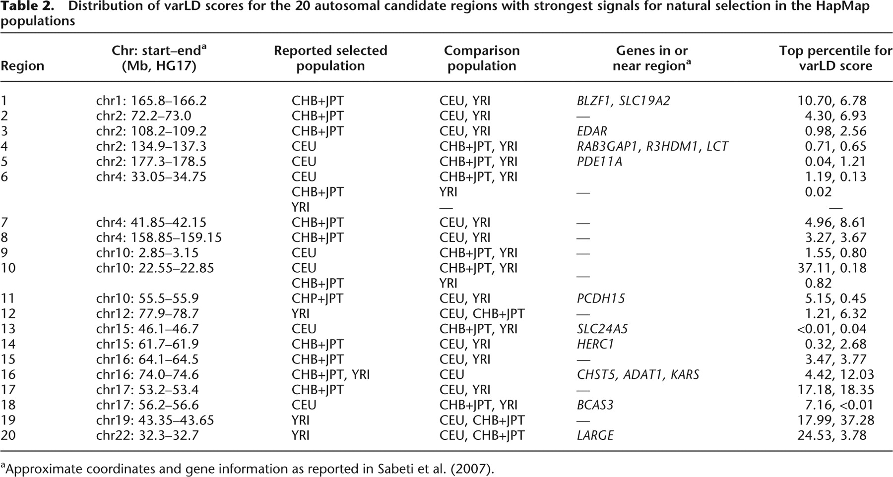 aApproximate coordinates and gene information as reported in Sabeti et al. (2007).
