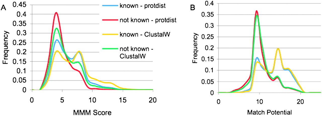 Known physical interactions have larger MMM scores. (A) The frequency distribution of MMM scores is shifted to higher values for known physically interacting proteins (blue and yellow) when compared to all matrix pairs for which no physical interaction is reported in the databases (red and green). This indicates stronger coevolution for known interacting proteins, and the difference is more pronounced when using matrices calculated with ClustalW (yellow vs. green) than with Protdist (blue vs. red). (B) Frequency distributions of the match potential, which is simply the largest possible match size theoretically obtainable in a comparison of the two matrices. The higher values seen here for known interactions indicate that these proteins are more prevalent and conserved. These plots were obtained with the MMM tolerance parameter set to 0.2 (allowance for 20% relative length mismatch) and without the use of a stepwise linear function adjusting this tolerance for extreme values of distance.