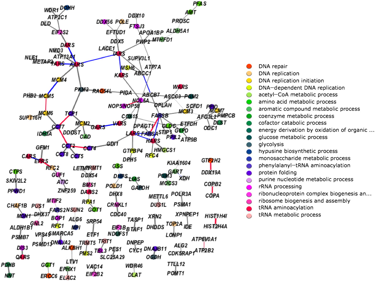 The coevolution network (#1 from Supplemental Table 1) of the most strongly coevolving proteins is shown with known physical protein interactions as red lines, and with KEGG pathway sharing as blue lines. The width of the lines is proportional to the MMM score minus the score to the average matrix. The proteins (nodes in the graph) are colored according to their GO annotation with the highest connectivity in the network. Given the detail in this figure, we also make it available as a supplemental Cytoscape file for more convenient viewing and manipulation.