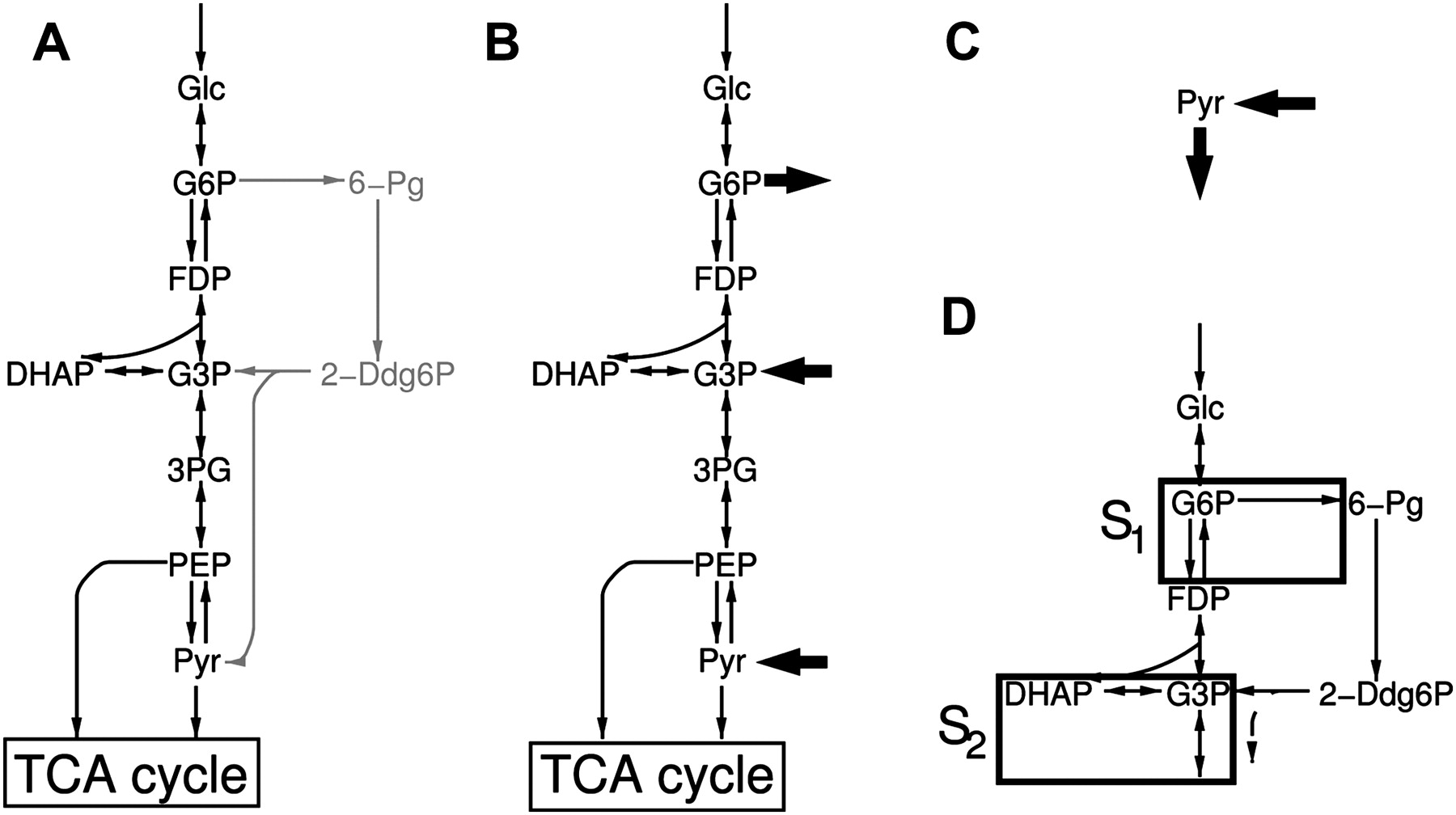 Examples for problems in elementary mode analysis. (A) Condensed network of glycolysis (dark reactions) and Entner–Doudoroff pathway (gray reactions). The pentose phosphate pathway has been omitted for clarity. In most analyses of glycolysis, the Entner–Doudoroff pathway is not considered. Hence, not all pathways from glucose into the TCA cycle are found, and the wrong conclusion might be drawn that only the pentose–phosphate pathway (not shown) can be used to bypass the knockout of one of the enzymes converting G6P to FDP. In vivo the knockout of the corresponding reactions is partially bypassed by a flux through the Entner–Doudoroff pathway (Fischer and Sauer 2003). (B) Modeling the Entner–Doudoroff pathway by adding an outflow of G6P and an inflow of G3P and Pyr only partially resolves the problem (thick arrows). Such an approach is often used in elementary mode analysis to avoid the consideration of some pathways in detail (e.g., the outflow of succinyl-CoA from the TCA cycle in Schuster et al. 1999, analyzed in Results). However, this can lead to fluxes like in C, which are not part of any feasible pathway when the entire network in A is considered. This is because the coupling of the influx of Pyr with the outflow reactions of G6P and the inflow reaction of G3P are neglected in B. (D) Elementary mode analysis does not allow one to analyze the dependencies between the subsystems S1 and S2 unless the reactions connecting them are taken into account. Thus, it is not possible to deduce that a zero flux from G6P to FDP in S1 would imply that there cannot be a positive flux from DHAP to G3P in S2. A list of abbreviations can be found in Supplemental material S2.
