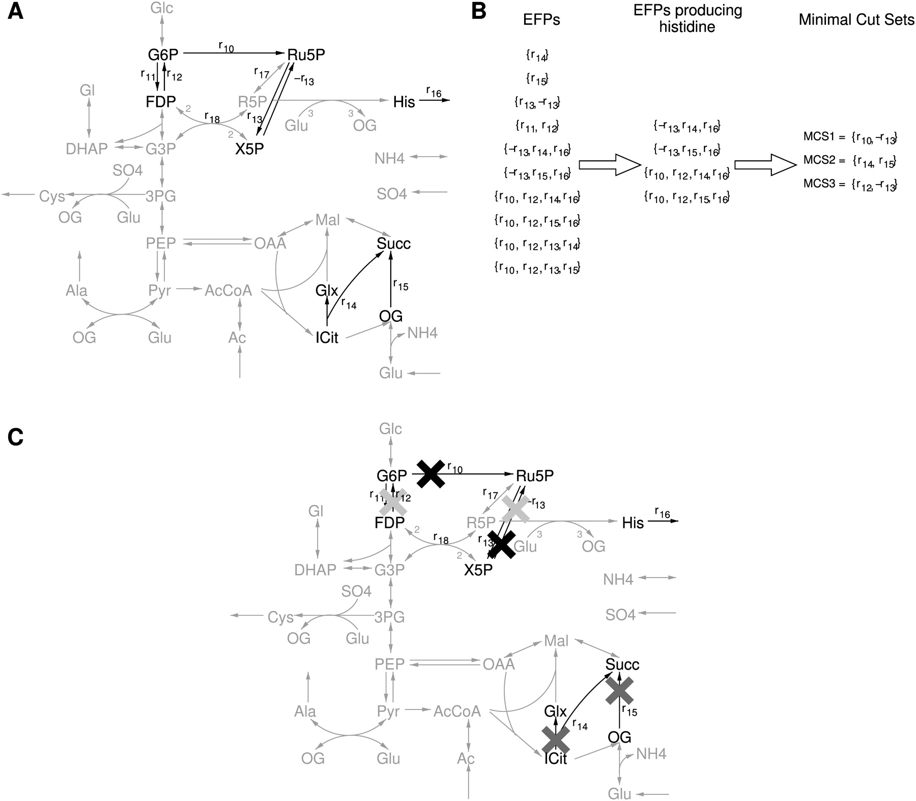 Scenario for the application of minimal cut sets. (A) Reaction network under consideration, which is supplied with acetate and glutamate. It is assumed that the production of histidine should be prevented. Histidine is produced from the central metabolism intermediate ribose-5 phosphate (Umbarger 1978). Assuming that it is not possible to entirely knock out the reactions r17 and r18 that directly produce ribose-5 phosphate, the reactions r10–r15 are defined as alternative targets (black reactions). (B) In order to determine minimal cut sets, r10–r15 are added to the subsystem containing the outflow reaction of histidine. From the elementary flux patterns, the minimal cut sets can be obtained. (C) Minimal sets of reactions that need to be knocked out to suppress the production of histidine: (black crosses) MCS1; (dark gray crosses) MCS2; (light gray crosses) MCS3. Subsequently, the minimal cut sets can be ranked according to different criteria, like side effects or required effort to knock out the corresponding genes, to determine the optimal knockout strategy. A list of abbreviations can be found in Supplemental material S2.