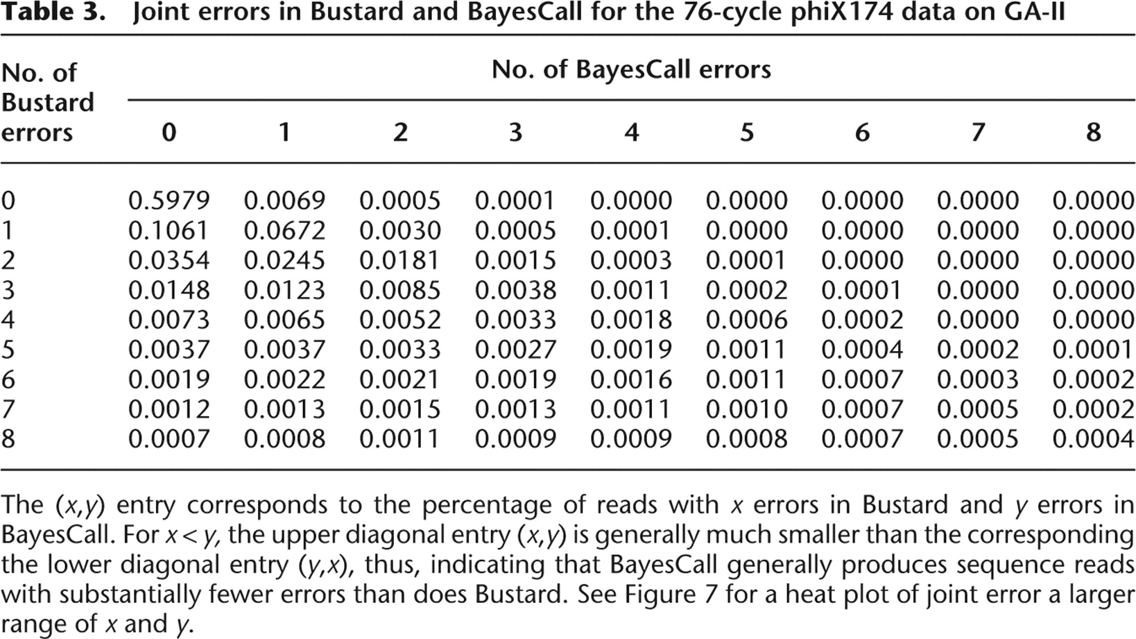 The (x,y) entry corresponds to the percentage of reads with x errors in Bustard and y errors in BayesCall. For x < y, the upper diagonal entry (x,y) is generally much smaller than the corresponding the lower diagonal entry (y,x), thus, indicating that BayesCall generally produces sequence reads with substantially fewer errors than does Bustard. See Figure 7 for a heat plot of joint error a larger range of x and y.