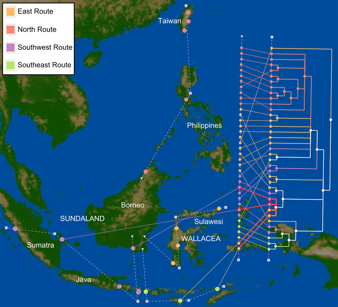 Map of Island Southeast Asia and Taiwan with hypothesized migration patterns of mtDNA haplogroup E1 encoded as geographic polylines. A triangle indicates the point of origin for each polyline on the island of Borneo. Most droplines connecting the geographic axis line to sample sites are omitted for clarity, but sites are colored according to their location relative to the proposed origin of haplogroup E1 and consequent migration route (Soares et al. 2008): Sulawesi (east) in orange, south Sundaland (south/southwest) in purple, south Wallacea (south/southeast) in green, and the northern points in pink. The optimal tree layout with 78 crossings is shown, with colored branches indicating leaves or groups of leaves that were exclusive to a single region once dereplication had been carried out (see Supplemental Methods). One southern subclade of E1 that contains both southeastern and southwestern sequences is highlighted, showing droplines that connect to its corresponding geographic locations.