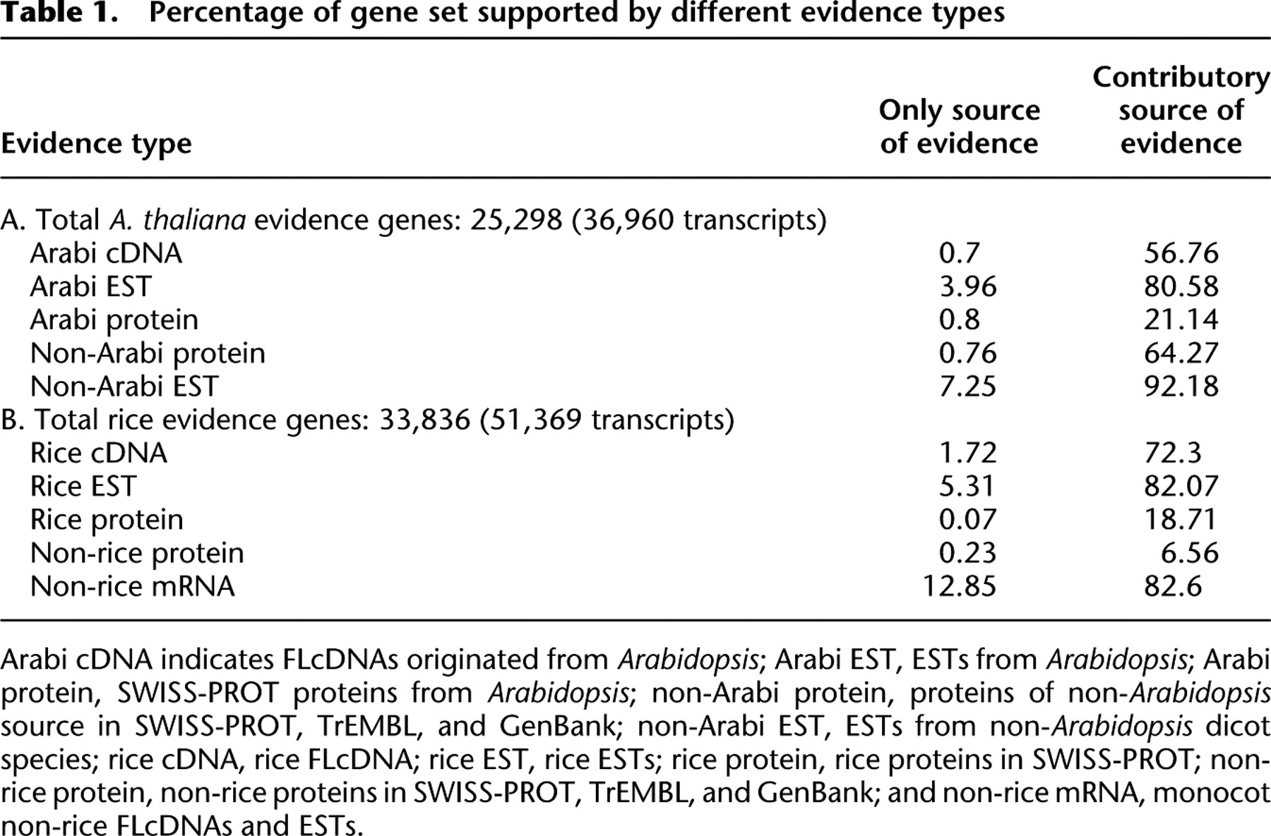 Arabi cDNA indicates FLcDNAs originated from Arabidopsis; Arabi EST, ESTs from Arabidopsis; Arabi protein, SWISS-PROT proteins from Arabidopsis; non-Arabi protein, proteins of non-Arabidopsis source in SWISS-PROT, TrEMBL, and GenBank; non-Arabi EST, ESTs from non-Arabidopsis dicot species; rice cDNA, rice FLcDNA; rice EST, rice ESTs; rice protein, rice proteins in SWISS-PROT; non-rice protein, non-rice proteins in SWISS-PROT, TrEMBL, and GenBank; and non-rice mRNA, monocot non-rice FLcDNAs and ESTs.