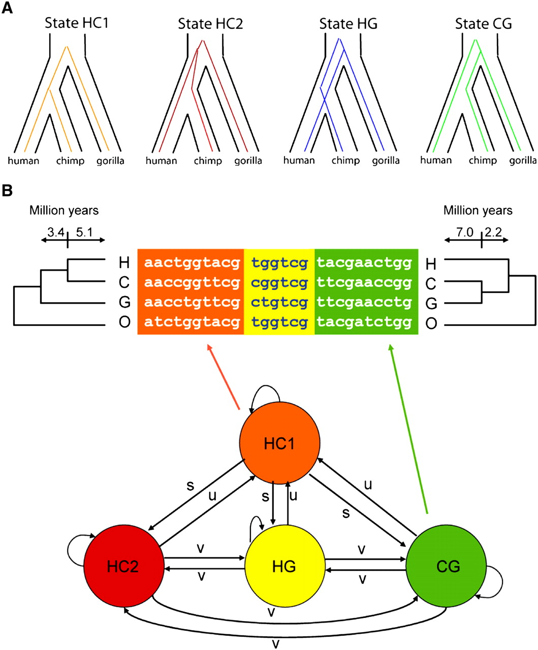 (A) The four genealogy types associated with the states of the hidden Markov model of Hobolth et al. (2007). State HC1 describes the case in which the human/chimpanzee coalescence occurs subsequent to the gorilla speciation. States HC2, HG, and CG describe the three possible topologies when the human/chimpanzee coalescence occurs prior to the gorilla speciation. Notice that states HC1 and HC2 both have the species topology, but with shallow and deep human/chimpanzee coalescences, respectively, while states HG and CG represent cases of incomplete lineage sorting (ILS). The orangutan is not shown here, but it is used as an outgroup in the analysis. The branch between the human/chimpanzee/gorilla and orangutan ancestors is assumed to be sufficiently long that ILS in this part of the phylogeny can be ignored. (B) The state-transition diagram for the HMM and an example alignment, with alignment blocks colored to match the states that generated them. The transition parameters s, u, and v, which are estimated from the data, reflect the rates of recombinations that convert one genealogy type to another. (Reprinted from Hobolth et al. 2007.)