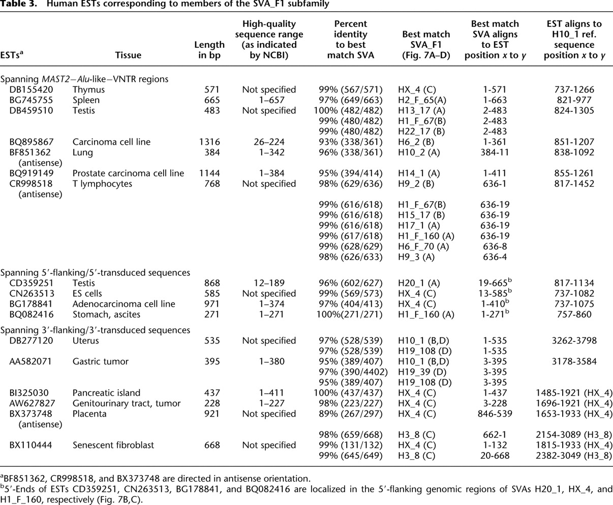 b5′-Ends of ESTs CD359251, CN263513, BG178841, and BQ082416 are localized in the 5′-flanking genomic regions of SVAs H20_1, HX_4, and H1_F_160, respectively (Fig. 7B,C).
