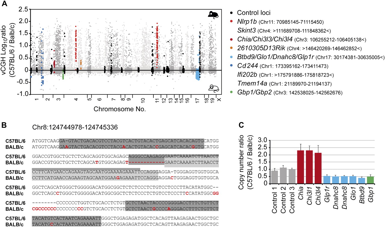 Detection of genetic variation. (A) The histogram shows a CGH-like presentation of combined signal intensities from the separate hybridizations of methylated and unmethylated DNA pools. Control loci (in black) show relatively few C57BL/6-enriched signals. Two regions (Nlrp1b and Skint, in red) are deleted in BALB/c, two regions (Chia/Chi3l3/Chi3l4 and 2610305D13Rik; in dark red and orange, respectively) are duplicated in C57BL/6, and five regions (Btbd9/Glo1/Dnahc8/Glp1r, Cd244, Ifi202b, Tmem14a, and Gbp1/Gbp2; in blue or green) appear (at least) duplicated in BALB/c. Genomic locations are provided for individual regions. The signs > and < indicate that the affected regions extended over the analyzed area. Data represent mean values of two biological replicates. (B) Sequences of an exemplary region where several probes (boxed in gray) showed C57BL/6-enriched signals. Compared to the reference strain, BALB/c contains several nucleotide exchanges (highlighted in red). (C) QPCR validation of three CNVs (Chia/Chi3l3/Chi3l4, three amplicons; Btbd9/Glo1/Dnahc8/Glp1r, five amplicons; Gbp1/Gbp2, one amplicon) detected by vCGH.