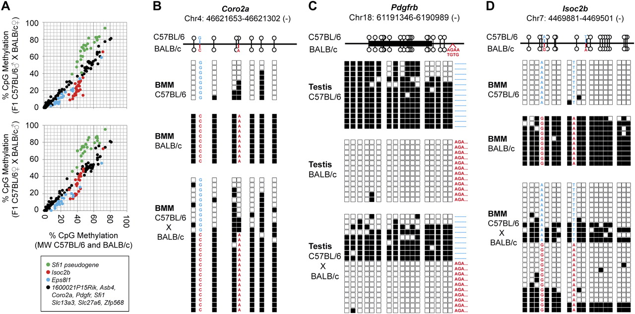 Strain-specific methylation patterns are mainly controlled in cis. (A) Averaged CpG methylation ratios of parental BMM (n = 3 for each strain) are plotted against averaged CpG methylation ratios of F1 hybrids derived from C57BL/6 (top, n = 5) or BALB/c (bottom, n = 3) sires. In eight out of 11 DMR analyzed by MALDI-TOF (marked in black), methylation patterns in F1 hybrids are almost identical to the average methylation level in parental strains (r2 > 0.97). Three DMR (Sfi1 pseudogene, Isoc2b, and Eps8l1, marked in red, green, and blue, respectively) either acquire (Sfi1 pseudogene) or lose methylation (Isoc2b, Eps8l1) in F1 hybrids relative to parental strains. (B–D) Allele-specific bisulfite sequencing of DMR in Coro2a (B, controlled in cis), Pdgfrb (C, controlled in cis), and Isoc2b (D, controlled in trans). The genomic position of CpGs within the amplicons is shown at the top. Sequence variations used to distinguish the different parental alleles are marked in blue for C57BL/6 and in red for BALB/c. Individual CpGs are represented by either white (unmethylated) or black (methylated) squares. Lines of squares represent independently sequenced clones derived from two independent sample preparations derived from reciprocal crosses. Three additional examples of DMR controlled in cis are given in Supplemental Figure S8.