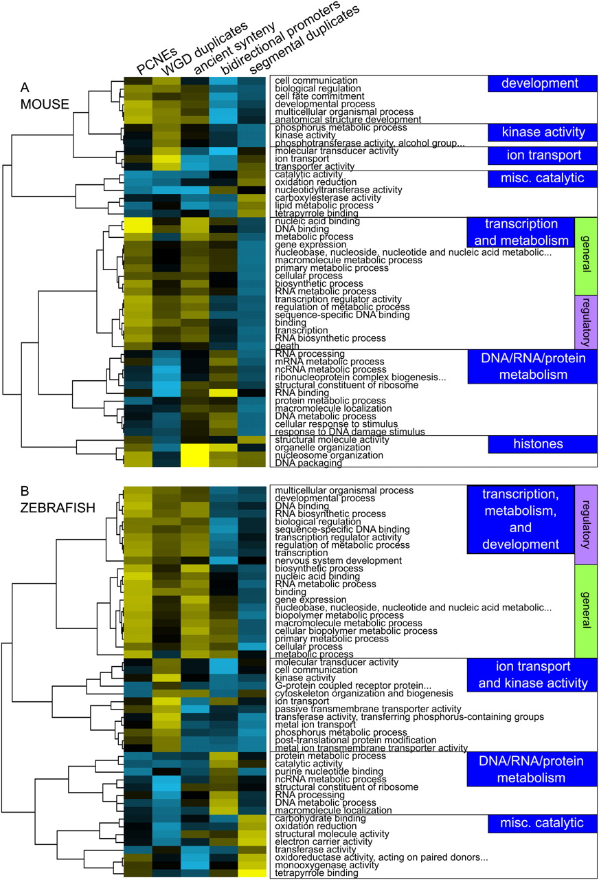 Different gene functions are associated with distinct patterns of genome evolution. Hierarchical clustering of gene functions (rows) and five genome evolutionary processes (columns): linkage to PCNEs, retention of duplicate genes after the early vertebrate WGD events, synteny conservation, bidirectional promoter, and segmental duplication. The gene functions are derived from the biological process and molecular function namespaces of the Gene Ontology; the 50 classes with the strongest associations are shown, using data from the mouse (A) and zebrafish (B) genomes. Yellow colors indicate that genes annotated with the GO term are more strongly associated with the genome evolutionary process than the genome-wide average; blue colors indicate less than the genome-wide average. The clustering procedure divides GO terms into groups that represent broad cellular processes (labels on the right), each of which is associated with a distinct pattern of genome evolution. All olfactory receptor genes were removed from the data prior to this analysis.