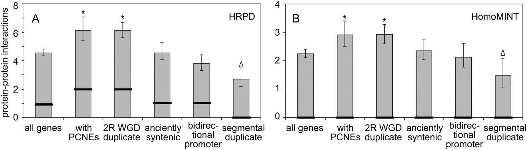 Retained WGD duplicates are overconnected and segmental duplicates are underconnected. The degree of protein–protein interaction (PPI) connectivity was estimated for mouse gene sets with different genome evolutionary characteristics using two different PPI databases, HPRD (A) and HomoMINT (B). Bar heights indicate the mean connectivity for each gene set. Each mean is bounded by a bootstrap-based 95% confidence interval. Median connectivity is indicated as a bold line, and the difference between the median and mean gives some indication of the right-skew of the connectivity distribution for each gene set. Genes with PCNEs or that are retained WGD duplicates have significantly more PPI connections than the genome mean (asterisks), while genes that are the result of segmental duplication have significantly fewer connections (triangles). Significance was assessed by a Bonferroni-corrected permutation test, α = 0.05.